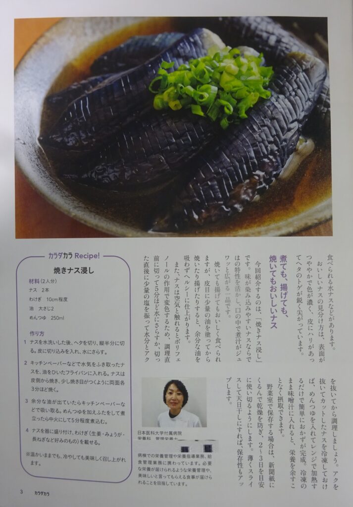 また、母校から 機関誌が届きましたので、毎回 料理の記事を その家政婦さんに あげています。因みに、今回は、下の画像のように 「茄子」でありました。なお、今回も、いつものように その機関誌ごと 家政婦さんに あげました。