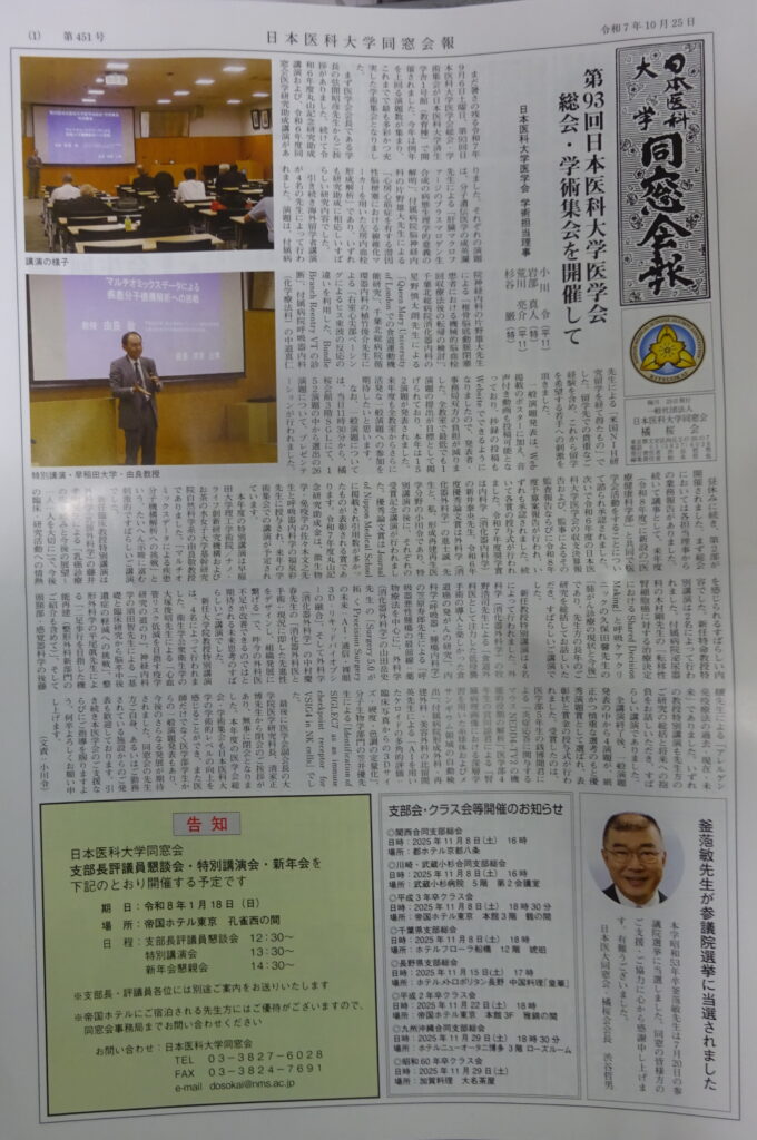 本日 届いた 母校の同窓会報の一面(令和7年[2025年]10月25日)