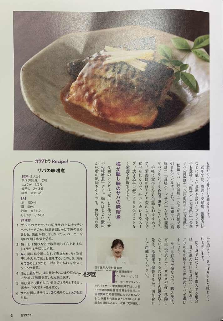 それから、母校から 機関誌が届きましたので、毎回 料理の記事を その家政婦さんに あげています。因みに、今回は、下の画像のように 「鯖」でありました。なお、今回も、いつものように その機関誌ごと 家政婦さんに あげました。