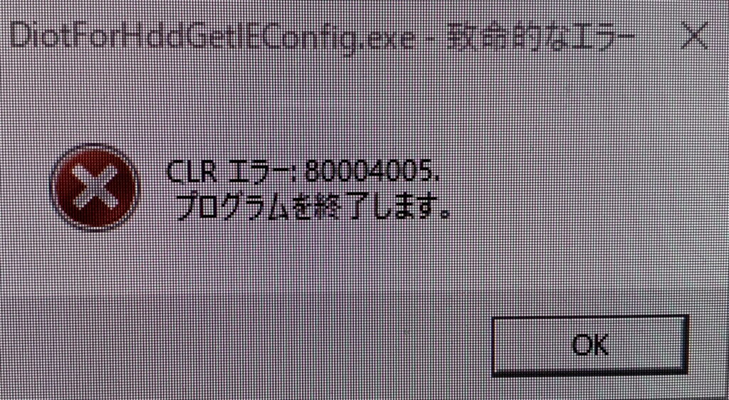 そのうえ、約8年 使用している 前述致しました デスクトップ・パソコンのことでありますが、下の画像の“致命的な エラー CLR エラー:80004005”という表示が しばしば 出るようになりました。因みに、もう お釈迦が近いのであるか と思われました。
