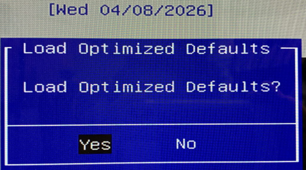 BIOSセットアップ・ユーティリティを起動して、「F9」を押して“YES”で “Enter”キーを押す(上に 本日 すなわち 4月8日[水]の日付が記されております)