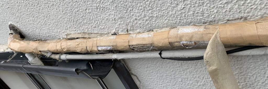 しかも、今朝も、上記のように 屋上で ラジオ体操第一を行ないました。すると、下の画像のように、エアコン(英語:air conditioner)の室内機 と 室外機を 繋 ぐ 銅管の周囲を巻いているテープ(英語:tape)が 剥 がれていて、このパイプ(英語:pipe)が 剥 き出しになっていることを発見しました。それで、今回も 下の写真のように、ガム・テープを用いて 応急処置をしました。因みに、雨が降る直前であり 強風下でありましたので、ガム・テープが揺れて 裏側も ぐるりと巻く対処が しにくかったです。