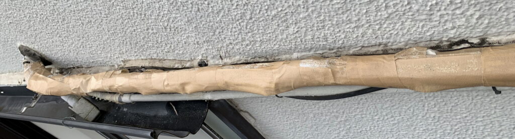 しかして、今朝も、上記のように 屋上で ラジオ体操第一を行ないました。すると、下の画像のように、エアコン(英語:air conditioner)の室内機 と 室外機を 繋ぐ 銅管の周囲を巻いているテープ(英語:tape)が 剥がれていました。それで、今回も 下の写真のように、ガム・テープを用いて 応急処置をしました。