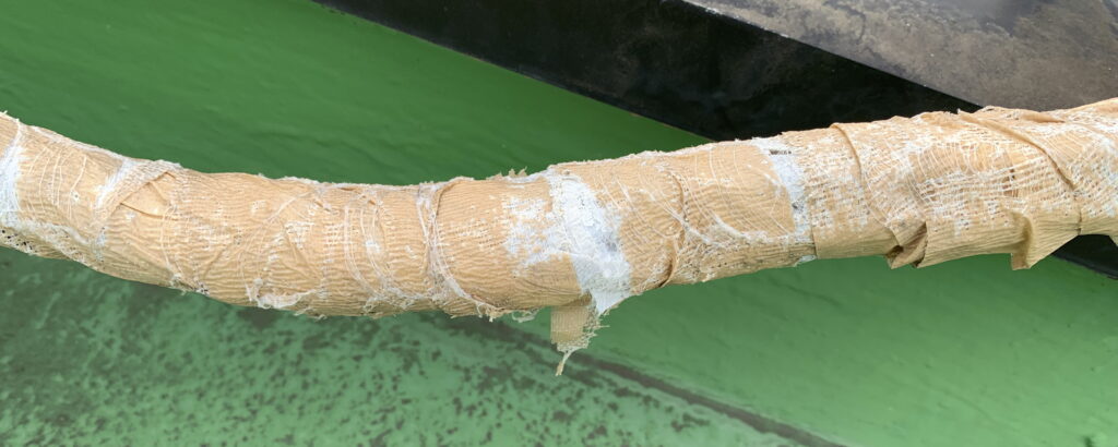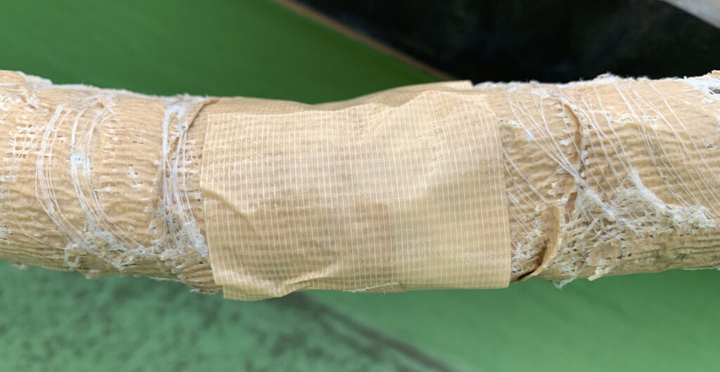 ガム・テープを用いて 応急処置をした パイプ(続いて 更に 裏側も ぐるりと巻きました)