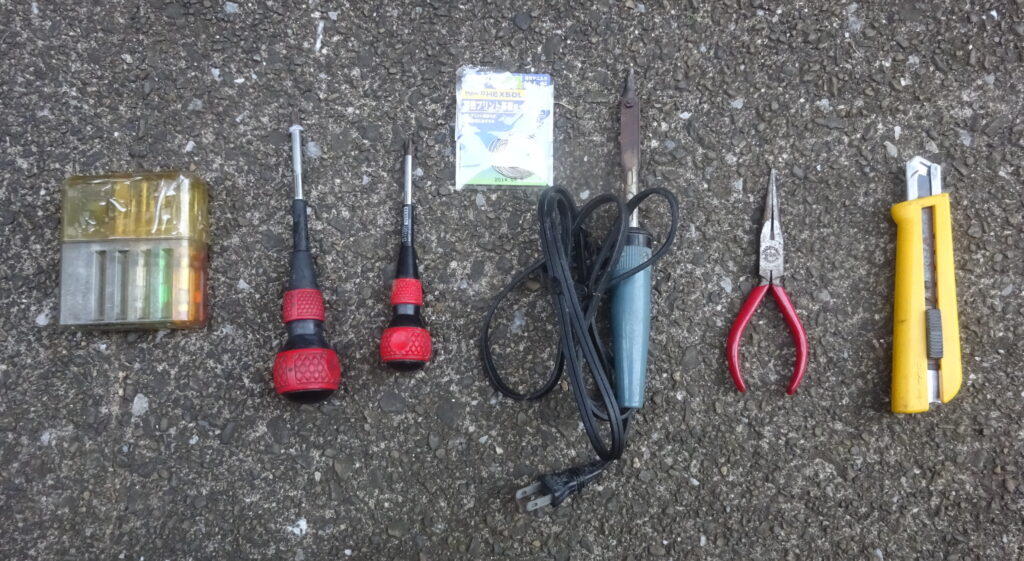 それで、下の道具を用いて 上記の電子レンジのときと同様に そのアース線を接続することを試みました。ところが、下の画像のように 数種類の プラス ドライバーを用意して 慎重に行なったにもかかわらず ネジの締め付けが 硬くて ネジの駆動部(ドライバーなどを差込むために空いている穴)が潰れそうになってしまいました。それで、誠に遺憾なことでありますが、そのアース線を接続することを諦めました。