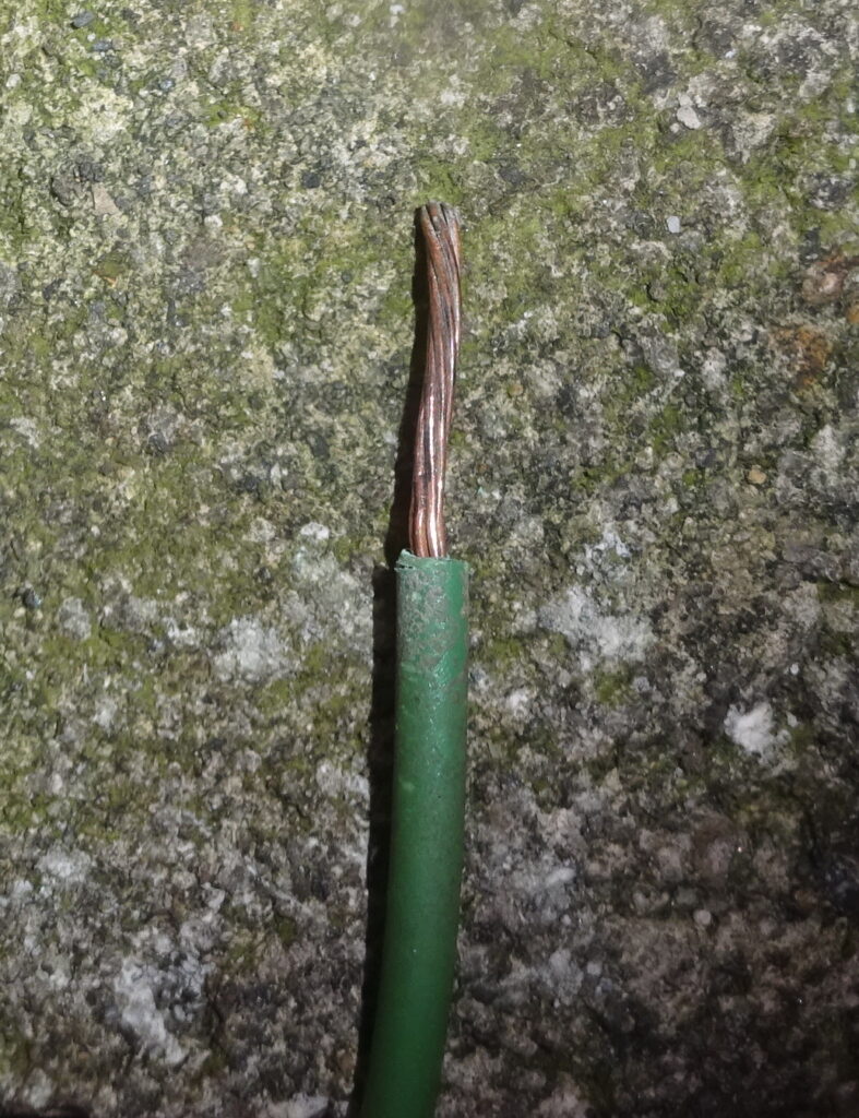 上の画像の ラジオ ペンチ と カッターを用いて アース線の被覆を剥きました(ニッパーもありますが、銅線を傷つけることがあるので、カッターを用いています。因みに、ワイヤー ストリッパーがある人は それを用いればいいと思われます)
