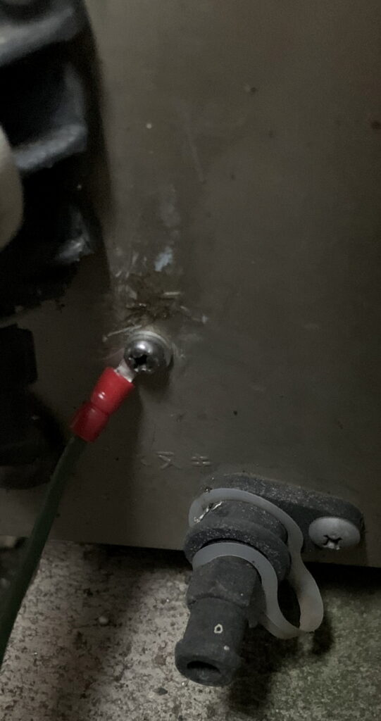 (後略)」と記させていただきました。それで、上記の担当者の方に委託しました。すると、誠に有り難いことに、なめたネジを ネジすべり止め液を使って 回してくれました。因みに、外側の金属の どこに アースしても いいのでありますが、アース線が アースの為の ネジのあるところ 迄 しか 届かないのであります。なお、誠に有り難いことに、下の画像のように アース線の先の輪金具迄 付けて アース線を接続してくれました。