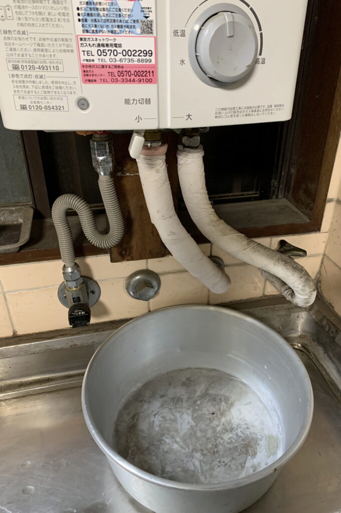 下部に 水受けの容器を置いていますが、やはり まだ 瞬間湯沸かし器の水漏れが認められます