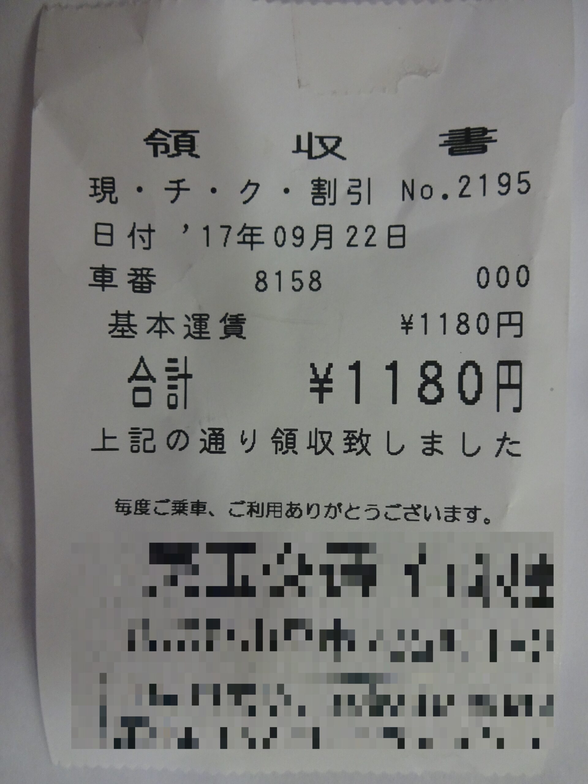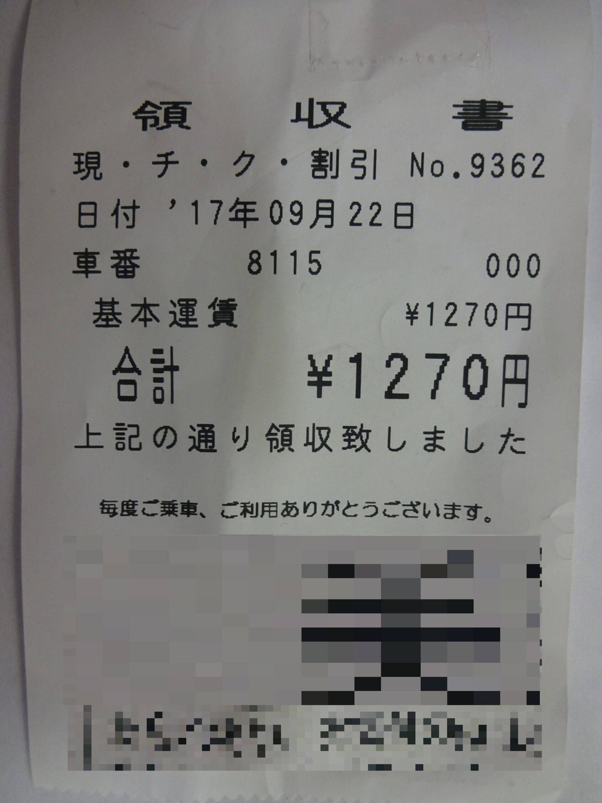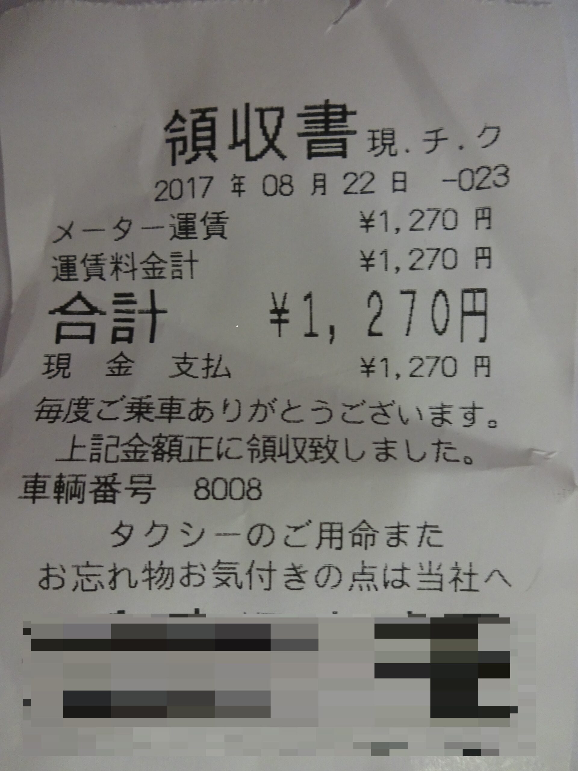 乗車した 往路分のタクシー領収書