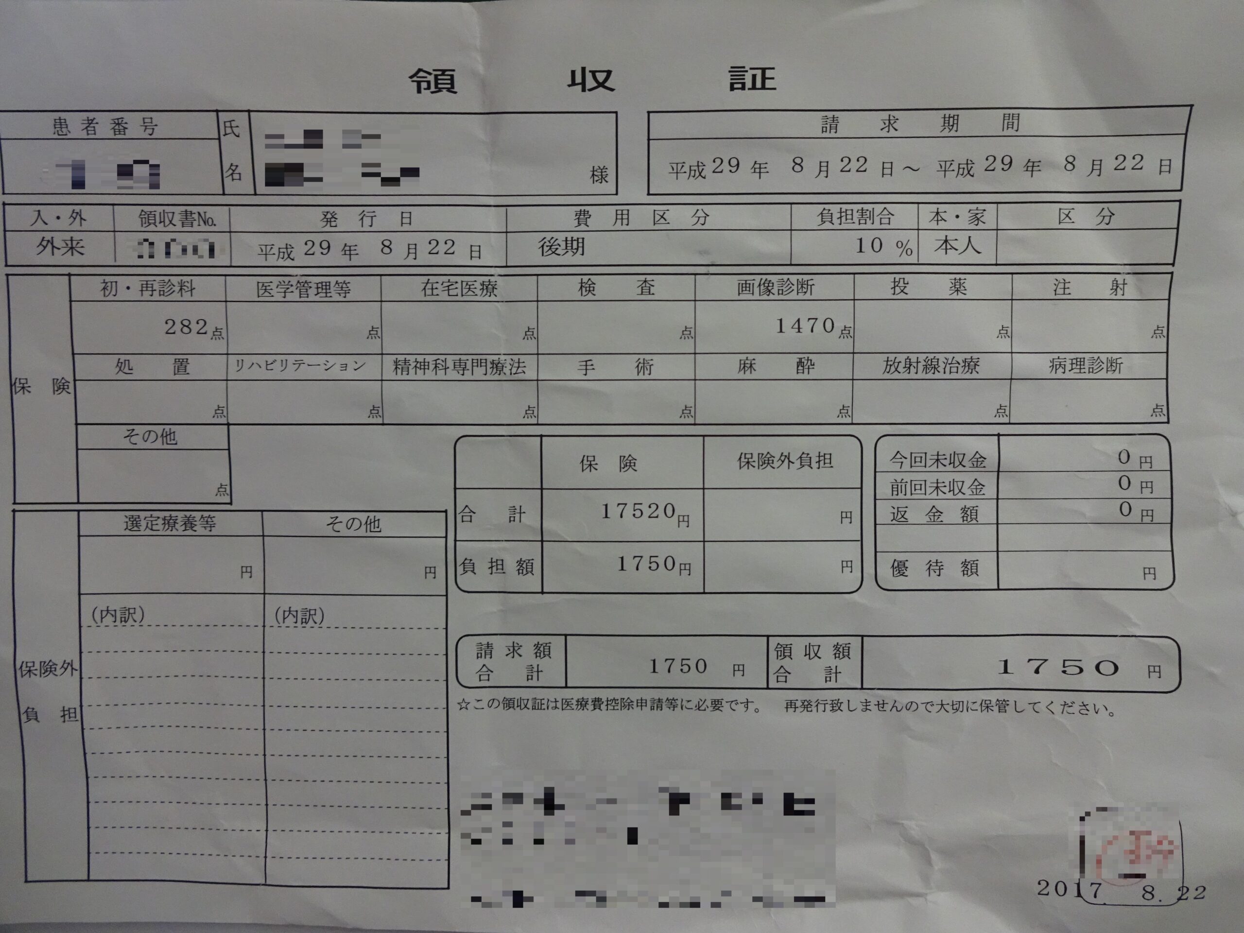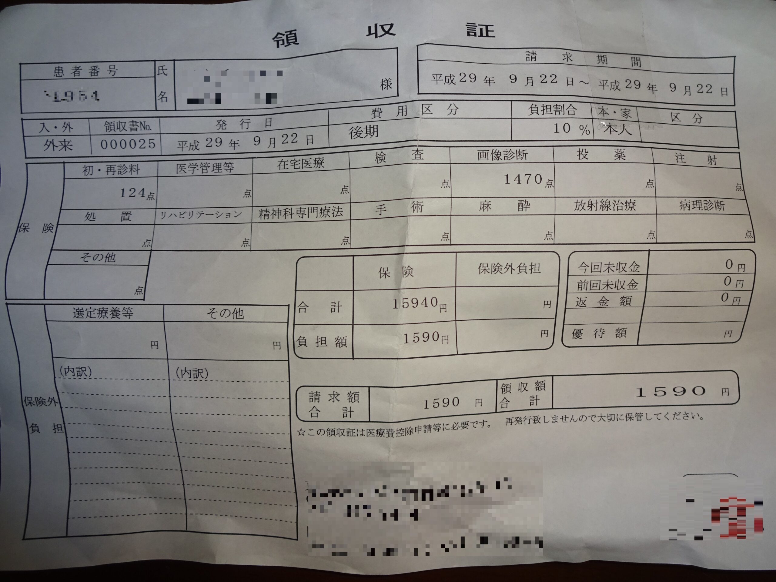 受診した脳神経外科の領収書