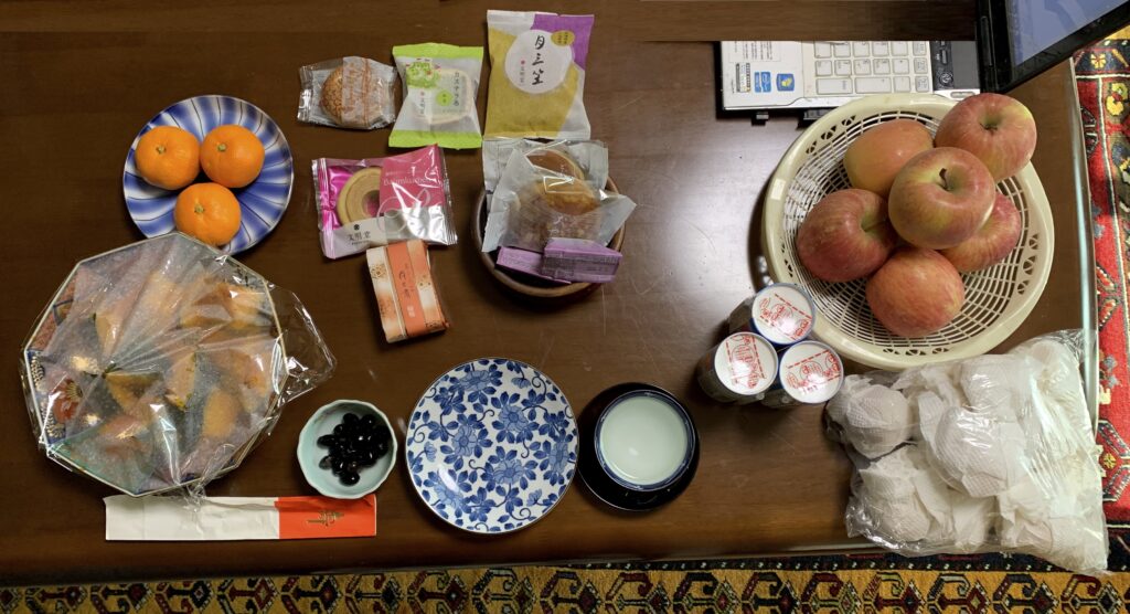おもてなし(どら焼き、月餅、くり饅頭まんじゅうとカステラ巻)(持ち帰れるように、袋を用意しました)