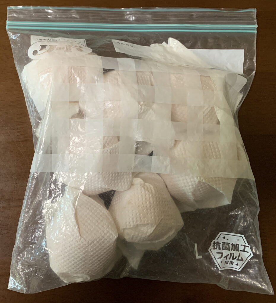 感謝の印として 袋に詰めて あげた、当家の庭で 朝摘あさづみをした 柚子ゆずの実(乾燥しないように、ひとひとつの 柚子ゆずの実を キッチン ペーパーで つつみ 冷蔵庫で保存しました)