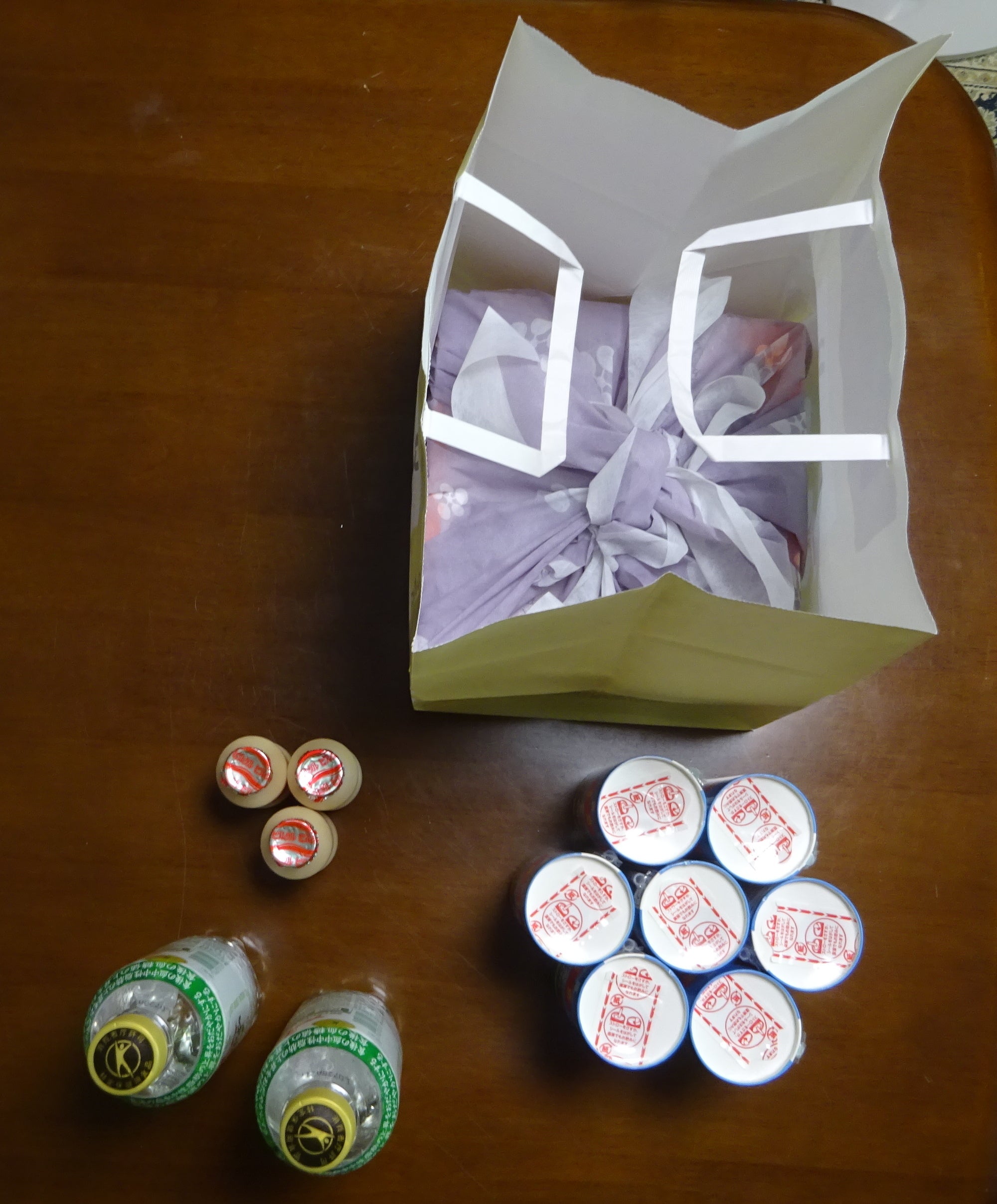 の100%ジュース、飲み物(乳酸菌飲料) と 京都から取り寄せた お煎餅などを それぞれ 七人分 そして 柚子の実を 十二個