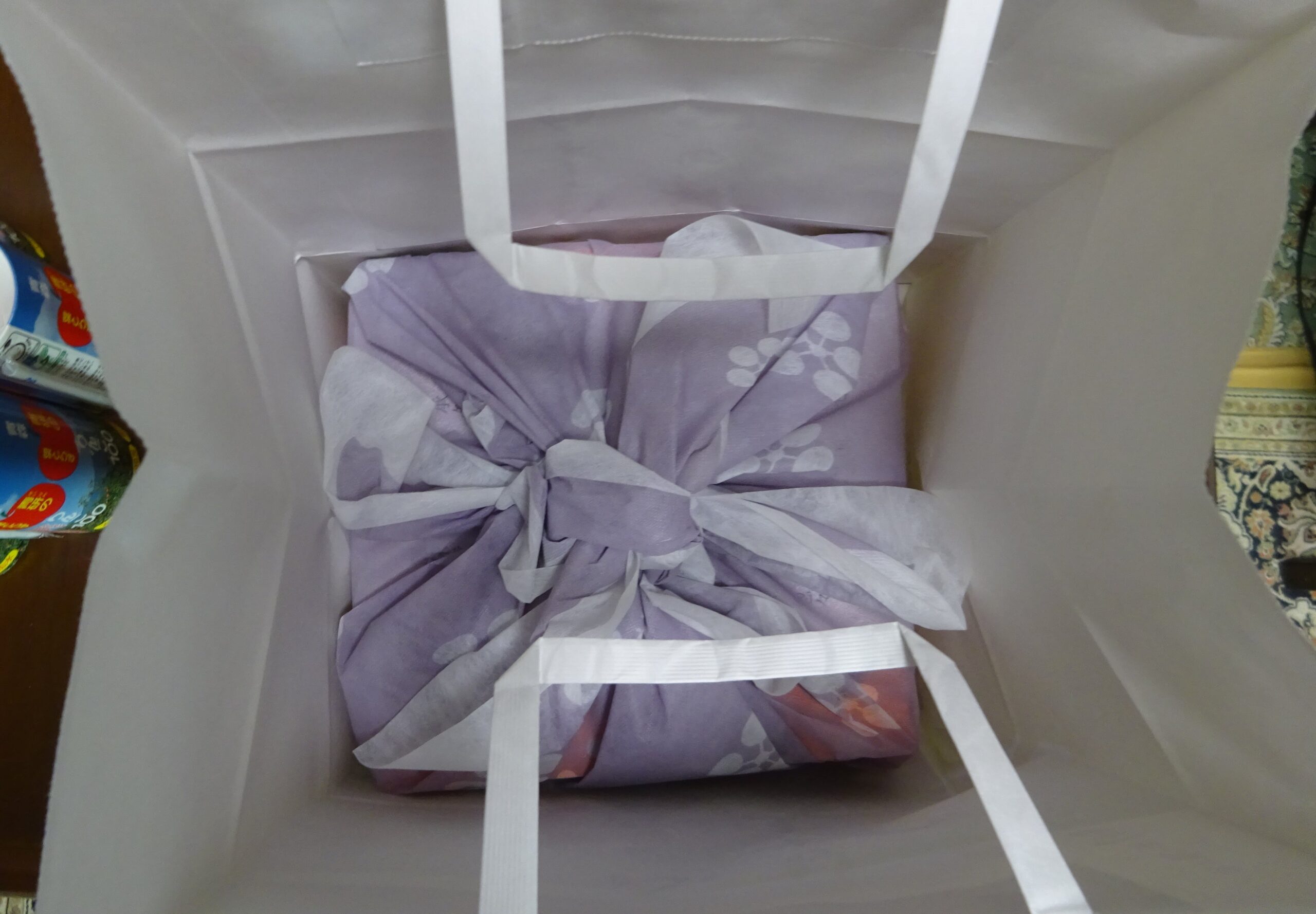 持ち帰り易いように 風呂敷で 包装した 減塩の南高梅の梅干し(1箱 すなわち 500g×2個入り)