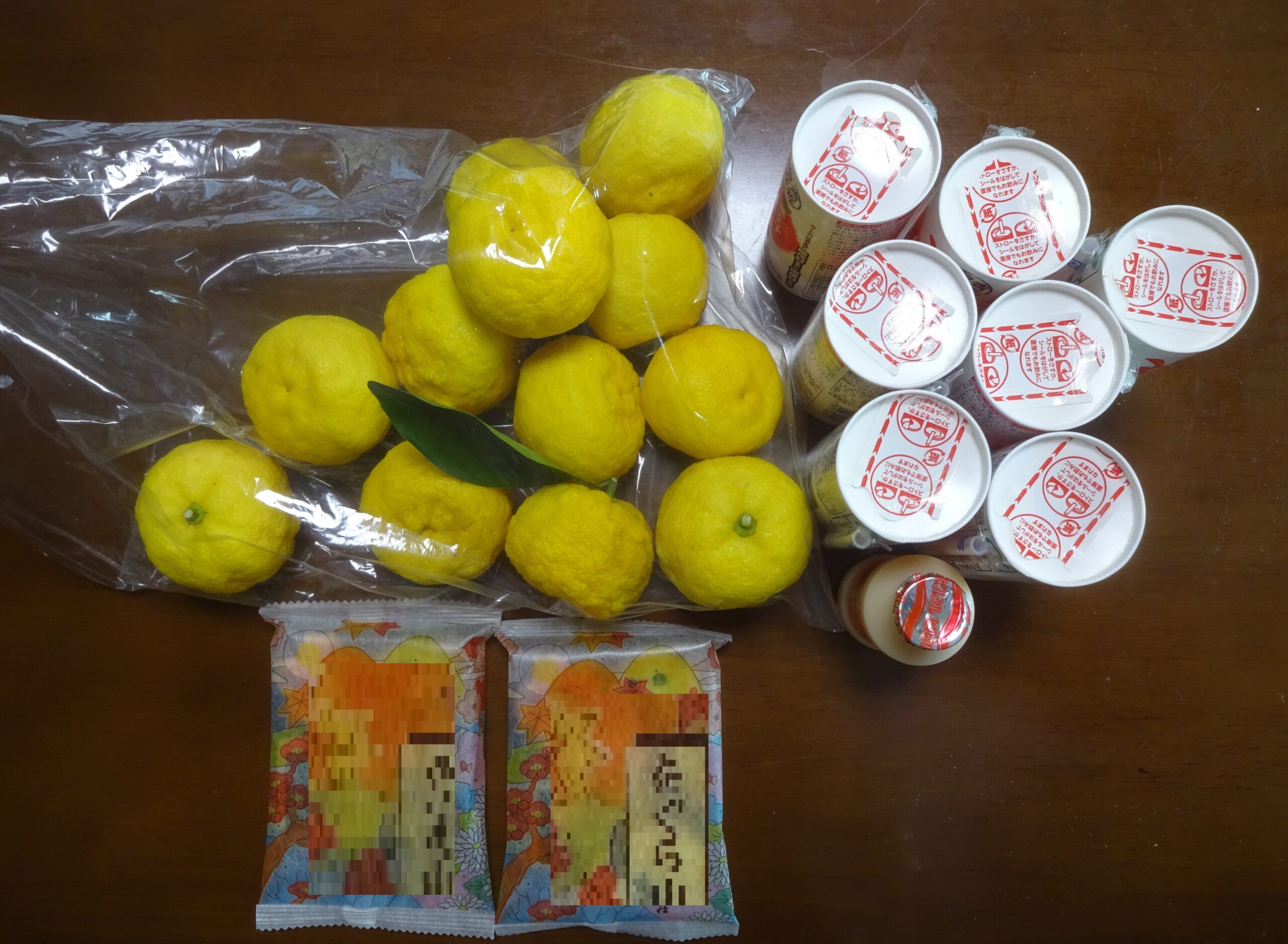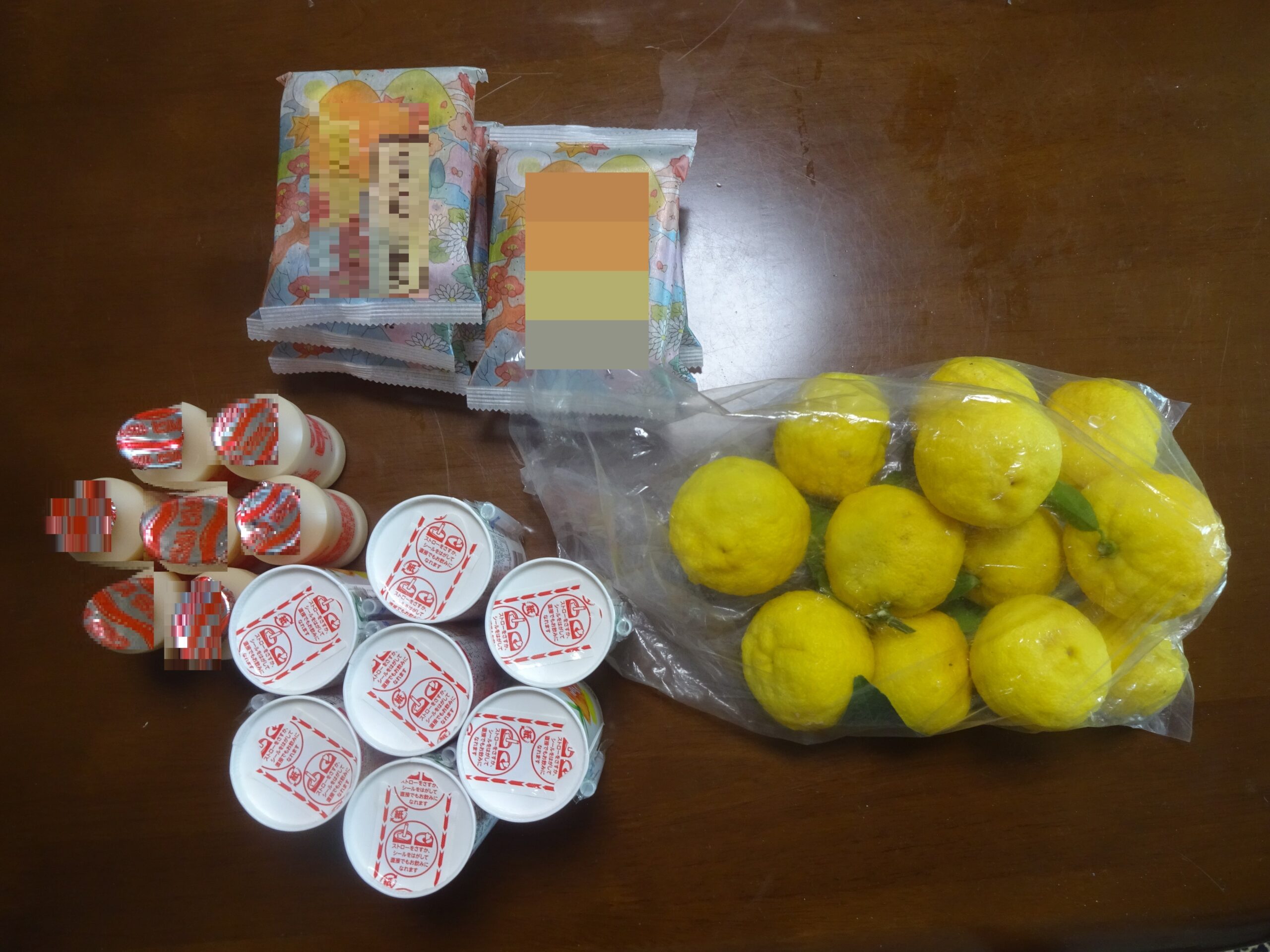の100%ジュース、飲み物(乳酸菌飲料) と 京都から取り寄せた お煎餅などを 七人分 そして 柚子の実を 十二個