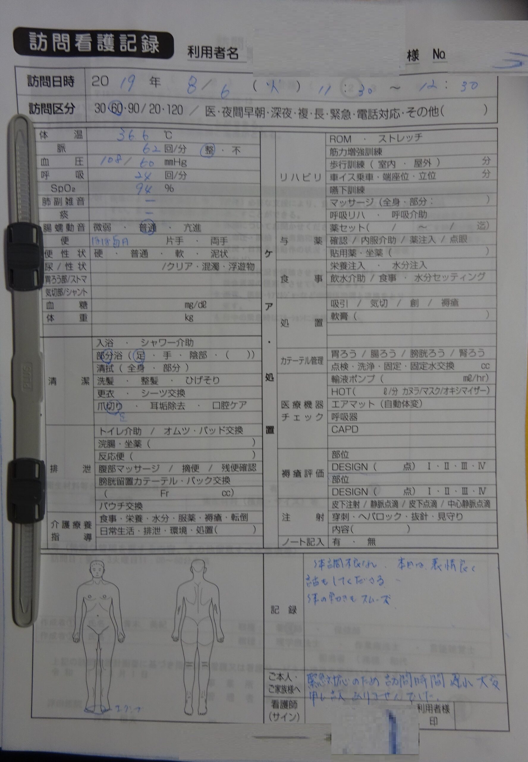 訪問看護記録(上に、本日 すなわち 8月6日の日付が記されています。ちなみに、上に 午前11時30分開始になっていますが、実際に到着したのは、上記のように 午前11時33分です。また、右下に、〖緊急対応のため〗 と おく れたむねが書かれてあります)