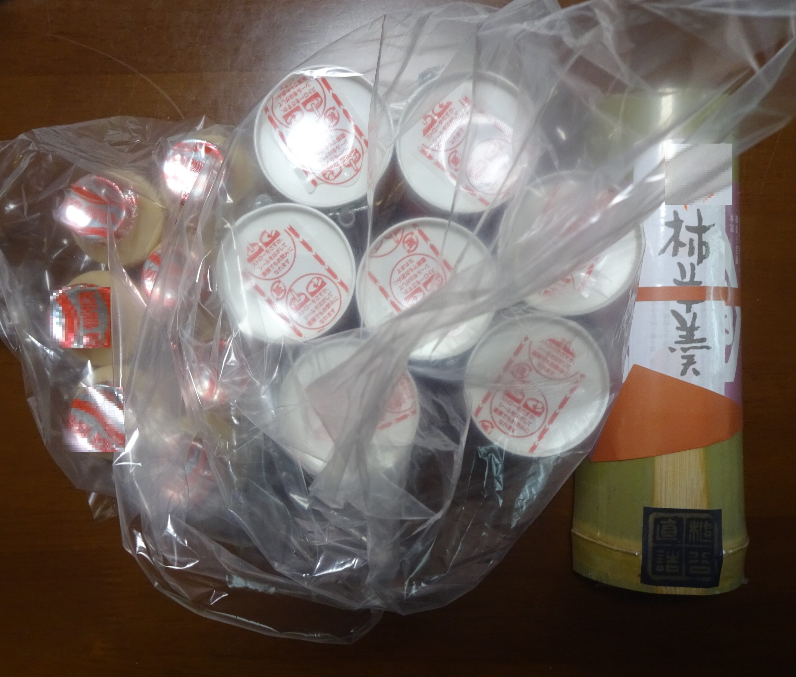 感謝の印として 持ち帰り易いように 袋に詰めて 手渡そうとして 準備した 自然の甘さの人参にんじんが含まれた りんごりんごの100%ジュース、栄養ドリンク そして 飲み物(乳酸菌飲料)などを それぞれ 七人しちにん