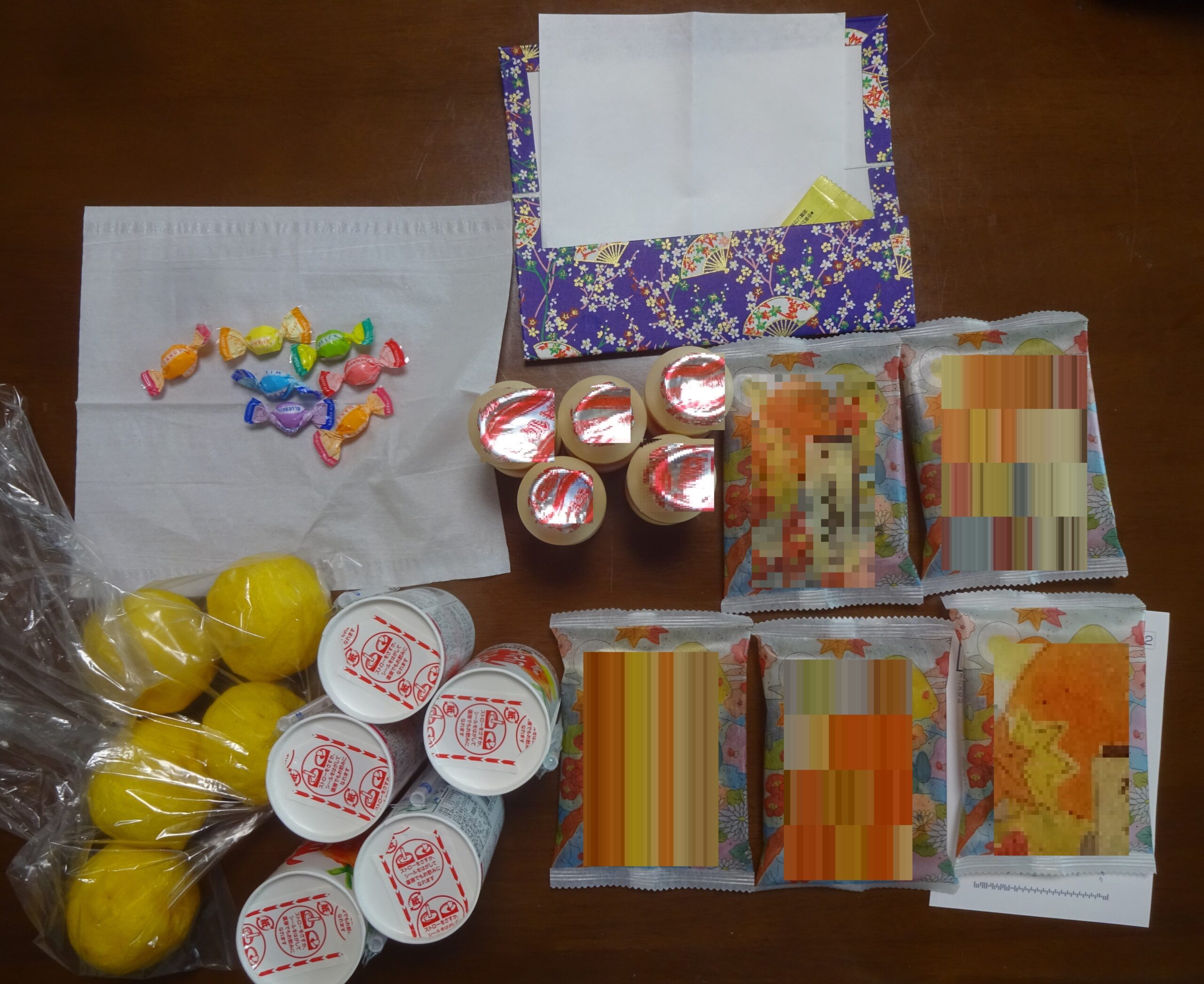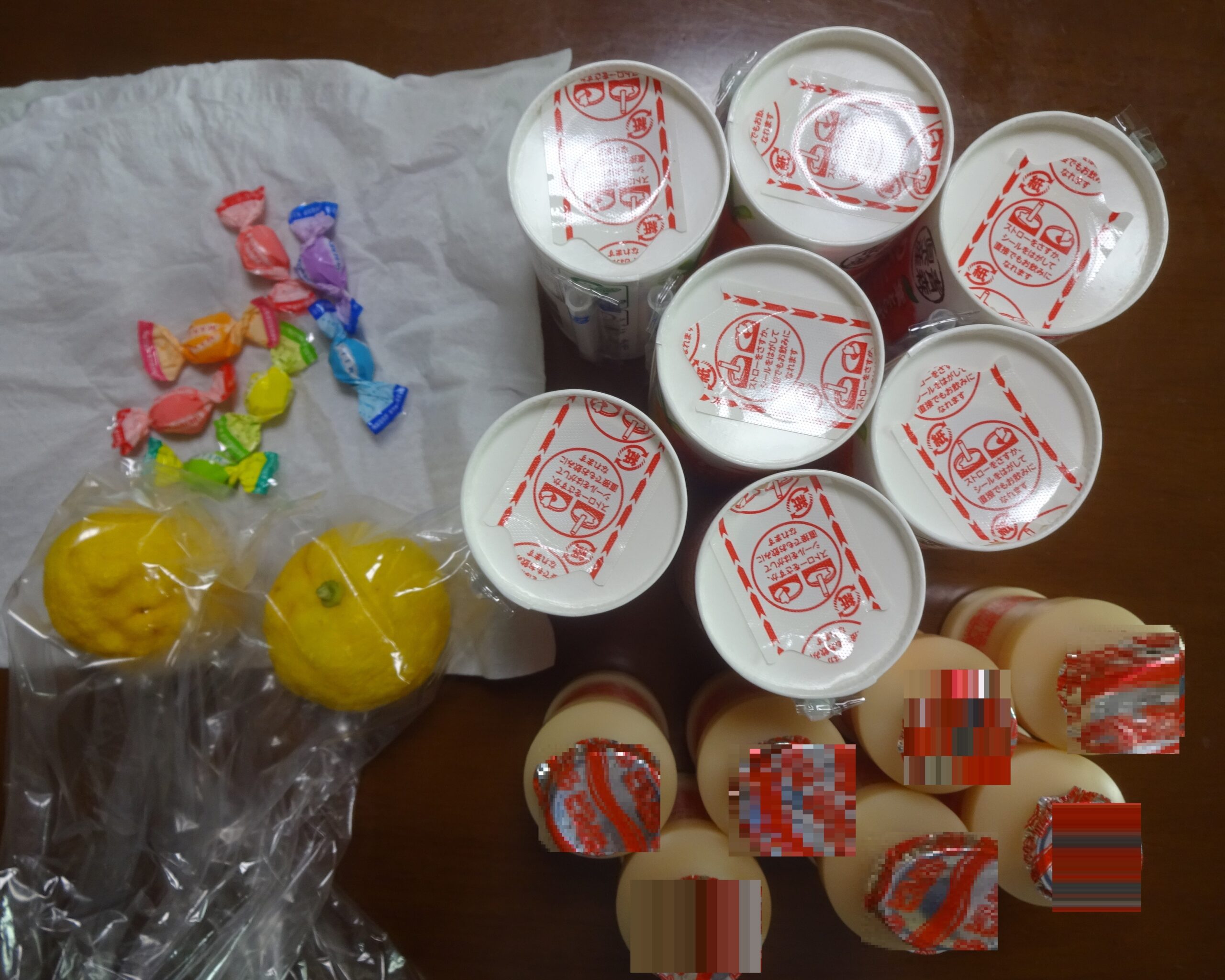 〘(前略)今回も 上記と同様に、下の画像のように 急遽きゅうきょ おもてなしの準備をしました。ところが、勧めても、今回も まったく 手を付けてくれませんでした。それで、上記の 自然の甘さの 人参にんじんが含まれた りんごりんごの100%ジュース、栄養ドリンク そして 飲み物(乳酸菌飲料)を それぞれ 七人しちにん分を 感謝の印として 手渡そうとしましたが、今回も 受け取ってもらえませんでした。なお、いつものように 代わりに 貴重な資料を手渡しました。