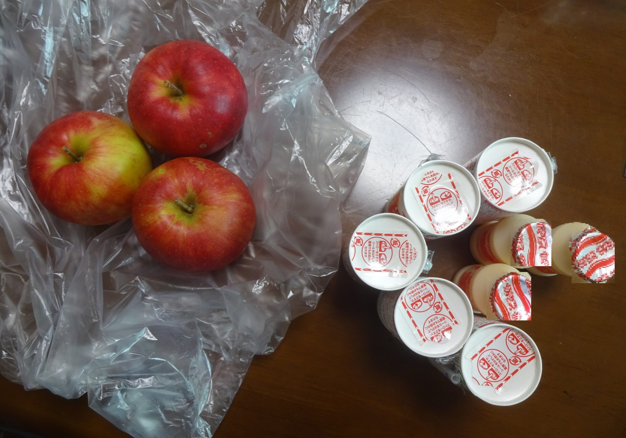 (後略)〗と記させて頂きました。今回も 上記と同様に、下の画像のように 急遽きゅうきょ おもてなしの準備をしました。ところが、勧めても、今回も まったく 手を付けてくれませんでした。それで、上記の 自然の甘さの 人参にんじんが含まれた りんごりんごの100%ジュース、栄養ドリンク そして 飲み物(乳酸菌飲料)を 感謝の印として それぞれ 七人しちにん分を 手渡そうとしましたが、今回も 受け取ってもらえませんでした。
