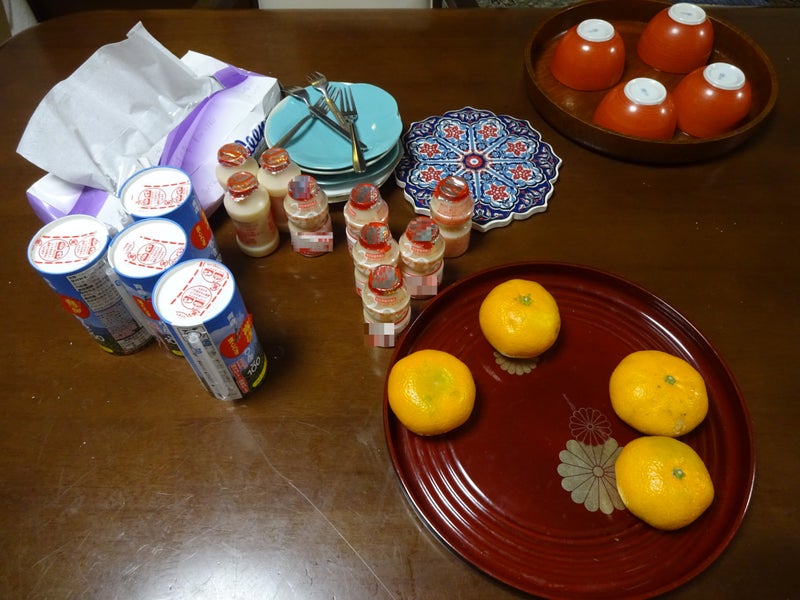 (後略)〙と記させて頂きました。今回も 上記と同様に、下の画像のように 急遽きゅうきょ おもてなしの準備をしました。ところが、勧めても、今回も まったく 手を付けてくれませんでした。それで、上記の 自然の甘さの 人参にんじんが含まれた りんごりんごの100%ジュース、栄養ドリンク そして 飲み物(乳酸菌飲料)を それぞれ 七人しちにん分を 感謝の印として 手渡そうとしましたが、今回も 受け取ってもらえませんでした。ちなみに、いつものように 代わりに 貴重な資料を手渡しました。なお、今年 最後の訪問看護でありますので、当方から 〘どうぞ よい年の瀬を お過ごし下さり、良い お年を お迎えになられて下さい。〙と伝えました。