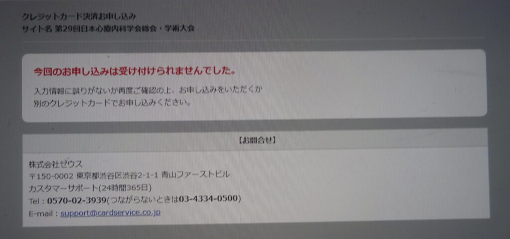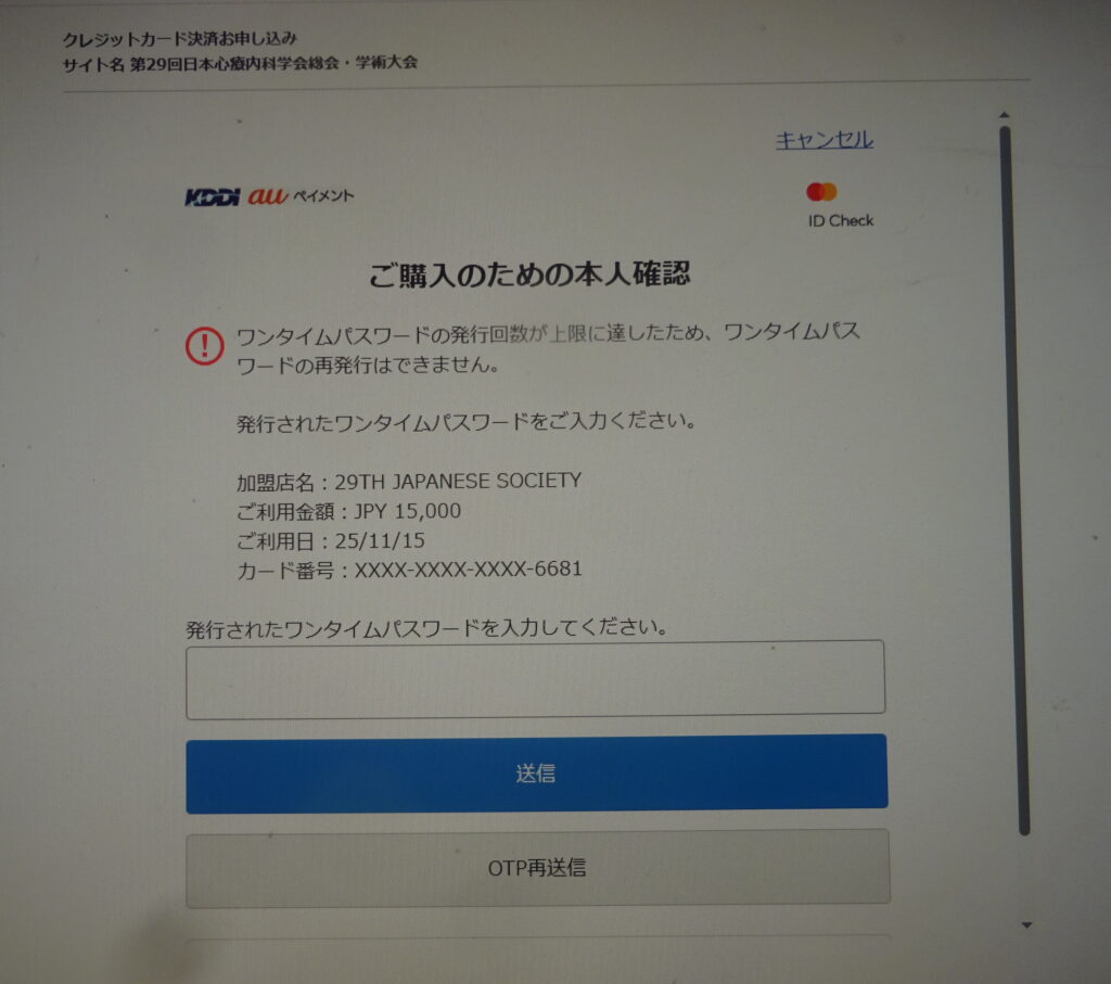および、本年も、本会(第29回日本心療内科学会総会・学術大会)に参加登録致しました。すなわち、フォームに入力して、クレジットカード決済の手続きを行いました。ところが、ワンタイムパスワード(OTP)が発行されて 決済が行なわれるのでありますが、誠に遺憾なことに 10分 待っても 登録した メール アドレスに届きませんでした。それで、仕方がないので ワンタイムパスワード(OTP)の再発行のボタンを押しました。しかし乍ら、それでも 20分 待って ワンタイムパスワード(OTP)が届きません。そこで、もう1度 ワンタイムパスワード(OTP)の再発行のボタンを押しました。すると、誠に遺憾なことに、下の画像の画面が出て 『今回のお申し込みは受け付けられませんでした。』とのことでありました。