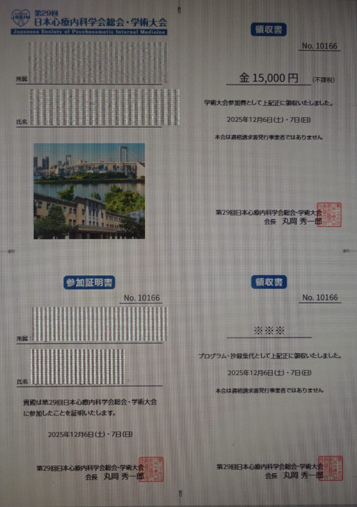 第28回 日本心療内科学会総会・学術大会の参加証明書 と 領収書(上記のように、会員・医師のところに 【✓】が付けられています)