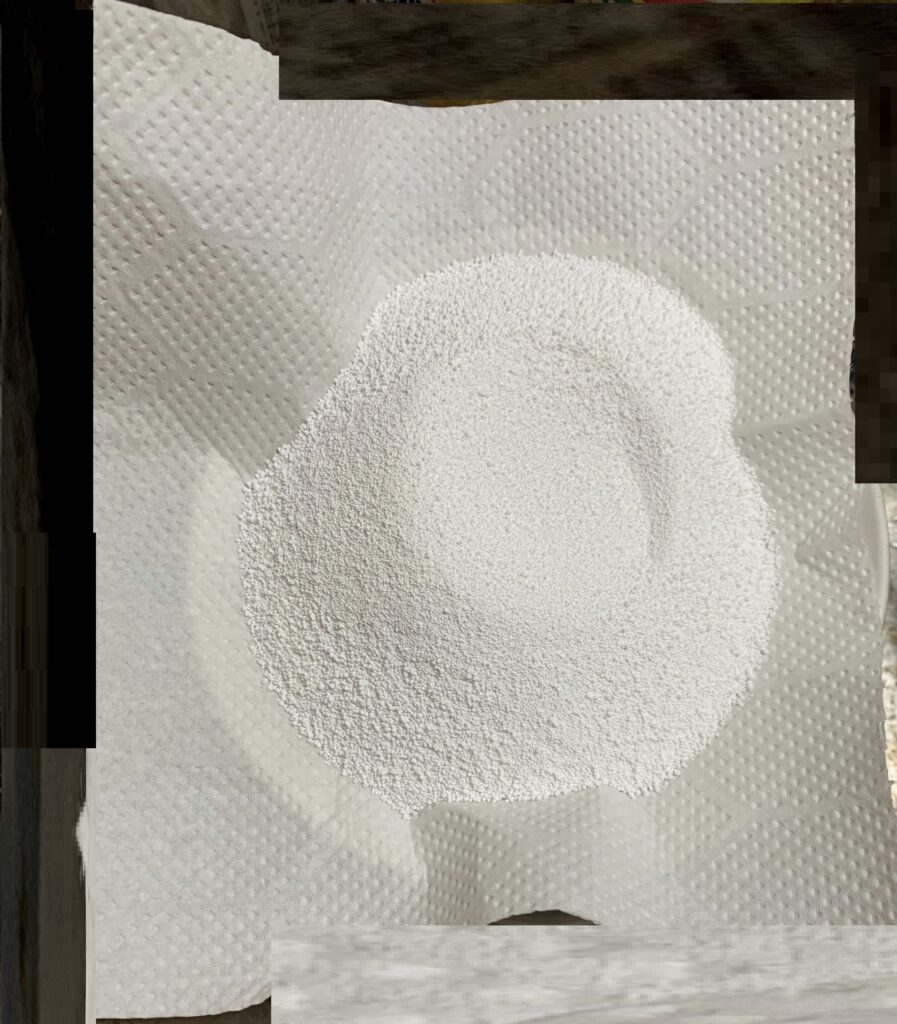 入手した 酸素系漂白剤(過炭酸ナトリウム)(【注意書き】を見ますと、酸素が発生するの為 パッケージに ピンホールを開けているとのことでありました。 因 みに、パッケージの上部に 小さな穴が 開けられていました。なお、その【注意書き】を見ていなければ、何で 穴が 開いているのだろうと思ったことでありましょう。序で乍ら、開けられているのは、酸素系漂白剤(過炭酸ナトリウム)の顆粒が 零れない位の小さな穴であります)