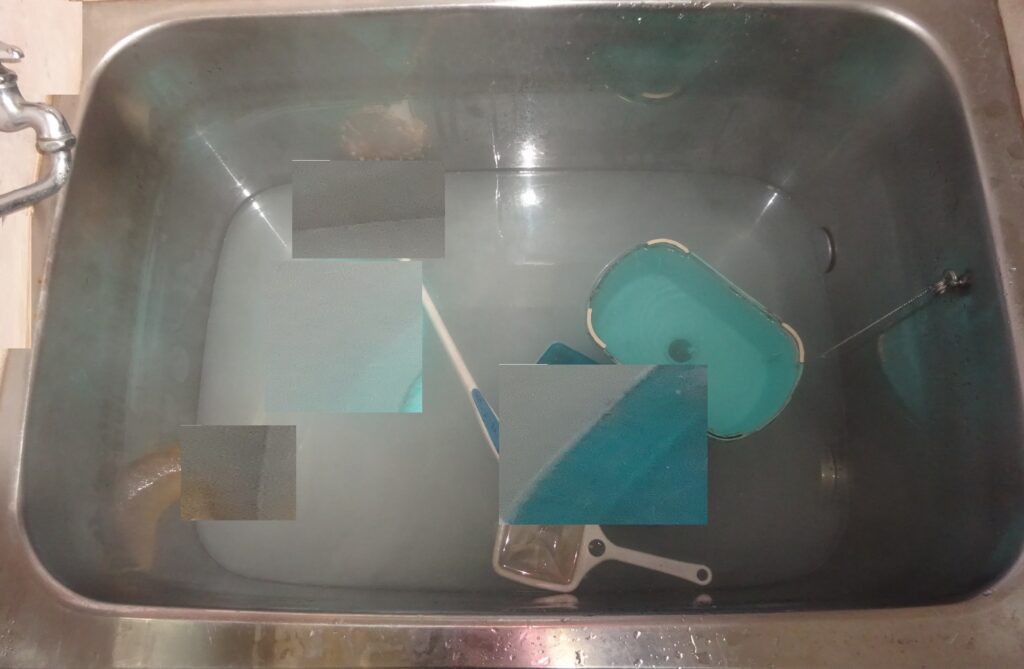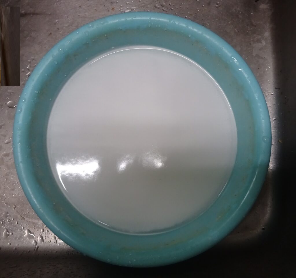 前述のように 酸素系漂白剤250グラムを 水(溶けやすいように お湯にしました)に溶かします。因みに、溶けにくいので、上の画像のように 洗面器に お湯を汲んで 溶かしてから入れるといいとされております