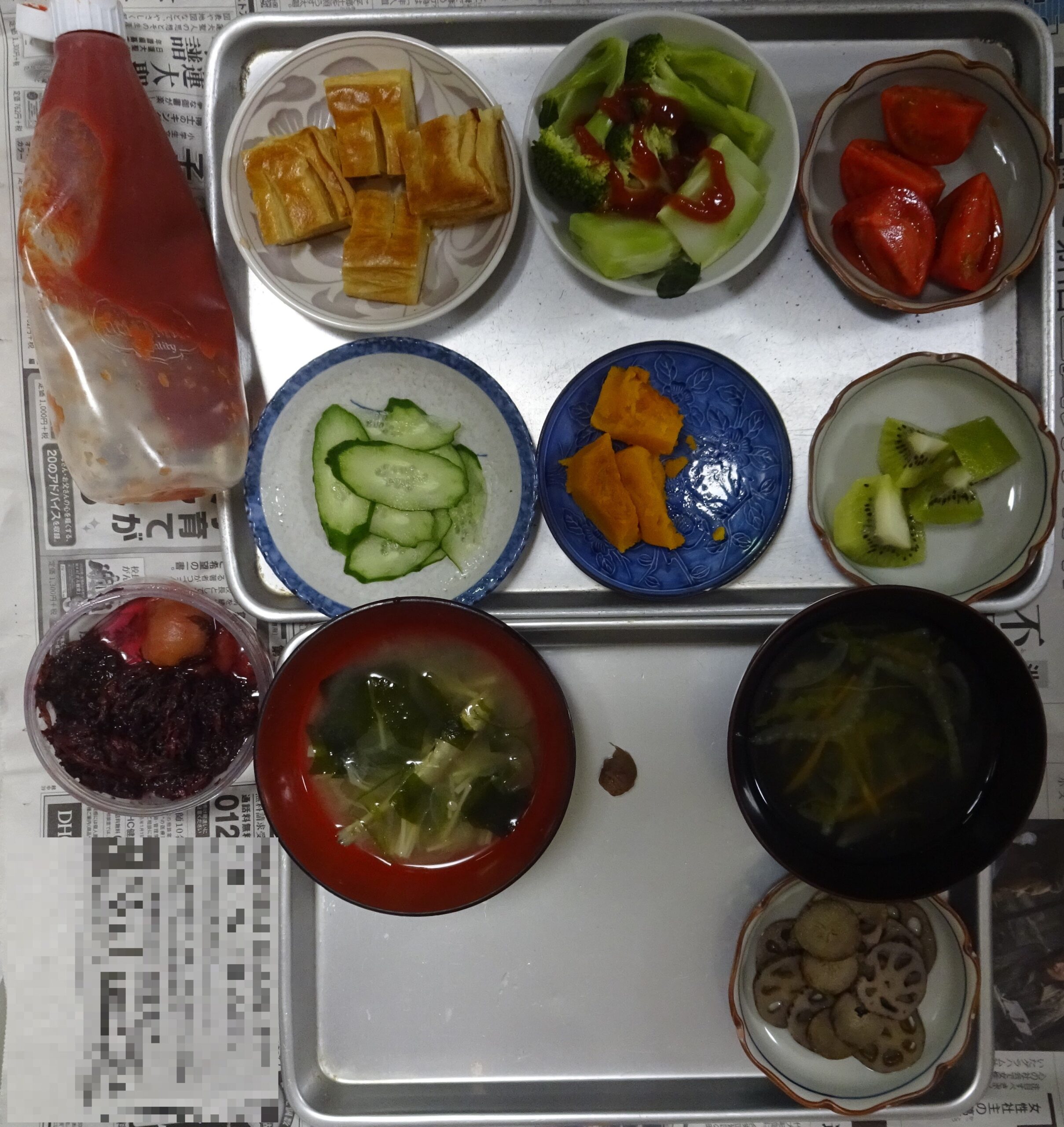 父親の朝食の一部(父親が 前日 寝られなくて 食欲がない と言うので、少しずつ 料理の品目を出しています。食べけています)