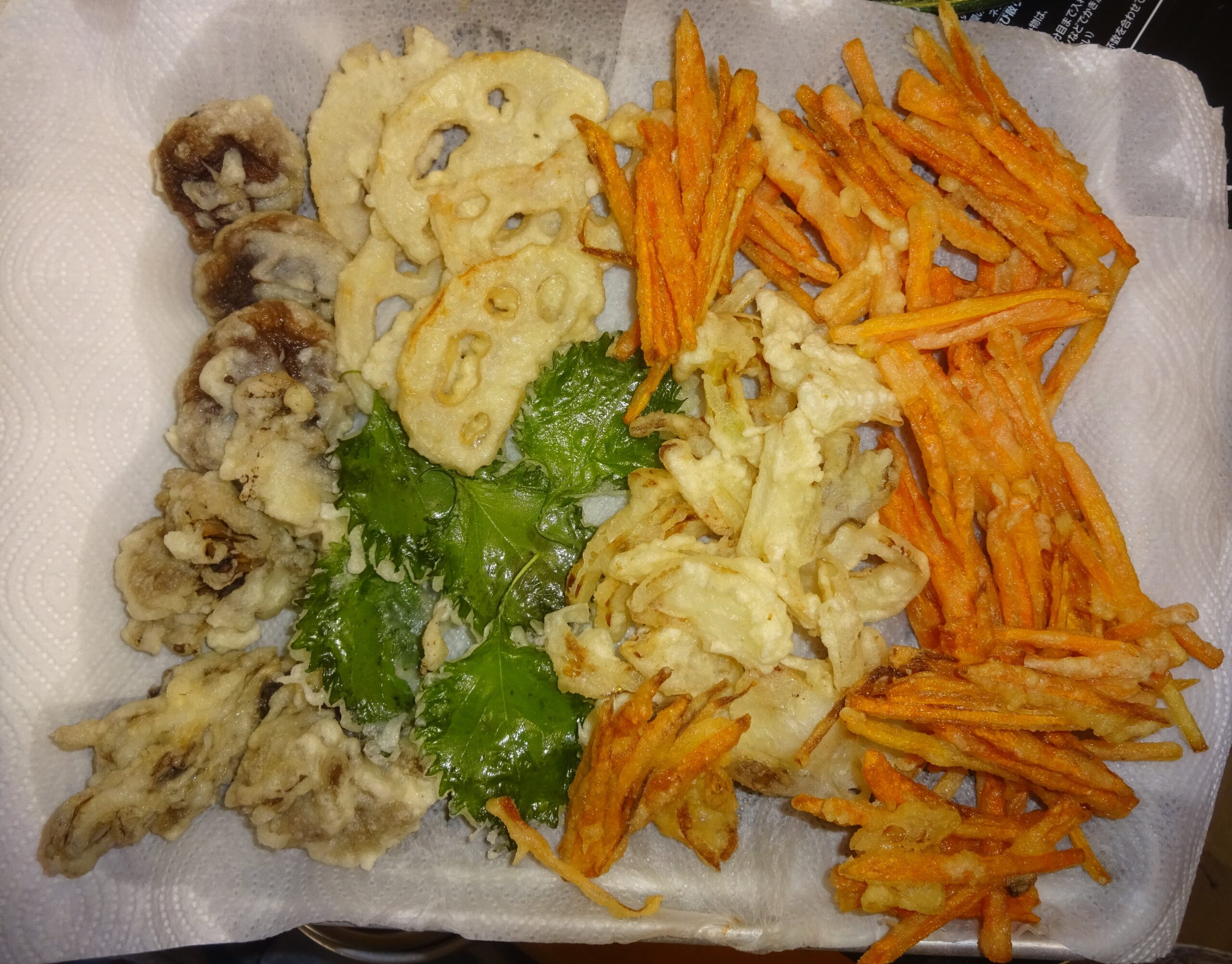 〔(前略)親鸞聖人しんらんしょうにんの好物と伺った 精進しょうじんげ(野菜天ぷら)(人参にんじん牛蒡ごぼう、いんげん、舞茸まいたけ玉葱たまねぎ そして  南瓜かぼちゃ)です。 ちなみに、一週間前に、 ヘルパー(日本語:家政婦)には、心の準備をしてもらうために、小麦粉 と 片栗粉を用いて ころもにして 精進しょうじんげ(野菜天ぷら)を作ってもらうことを伝えてありました。勿論もちろん、小麦粉 と 片栗粉の現物も見せました。ところが、当日になって このヘルパー(日本語:家政婦)によりますと、片栗粉を使ったことがない とのことでした。それで、事前に調べてありましたので、小麦粉 と 片栗粉の比は 10:1であることを伝えました。しかも、手引書を印刷して来て、このヘルパー(日本語:家政婦)に手渡しました。なお、去る8月19日(日)の〘家政婦への贈り物(うなぎ蒲焼かばやき・161[父親の食事])〙のブログの中段やや下に、
