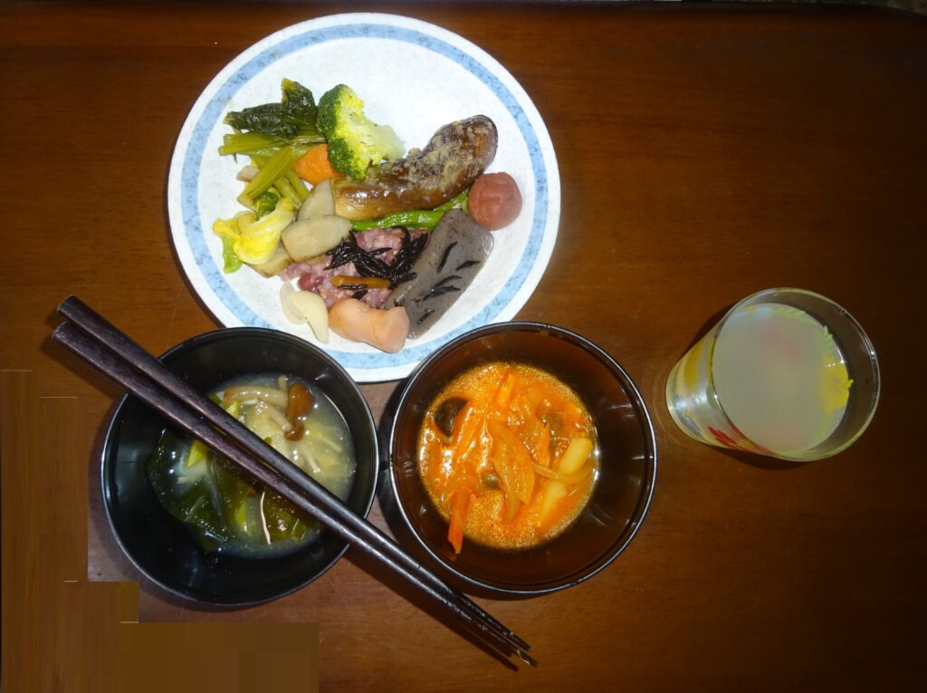 家政婦さんが みずから いいだけ お皿に盛った おかず、味噌汁 と 玄米御飯であります(これに 梅干うめぼし と らっきょうがくわわります)