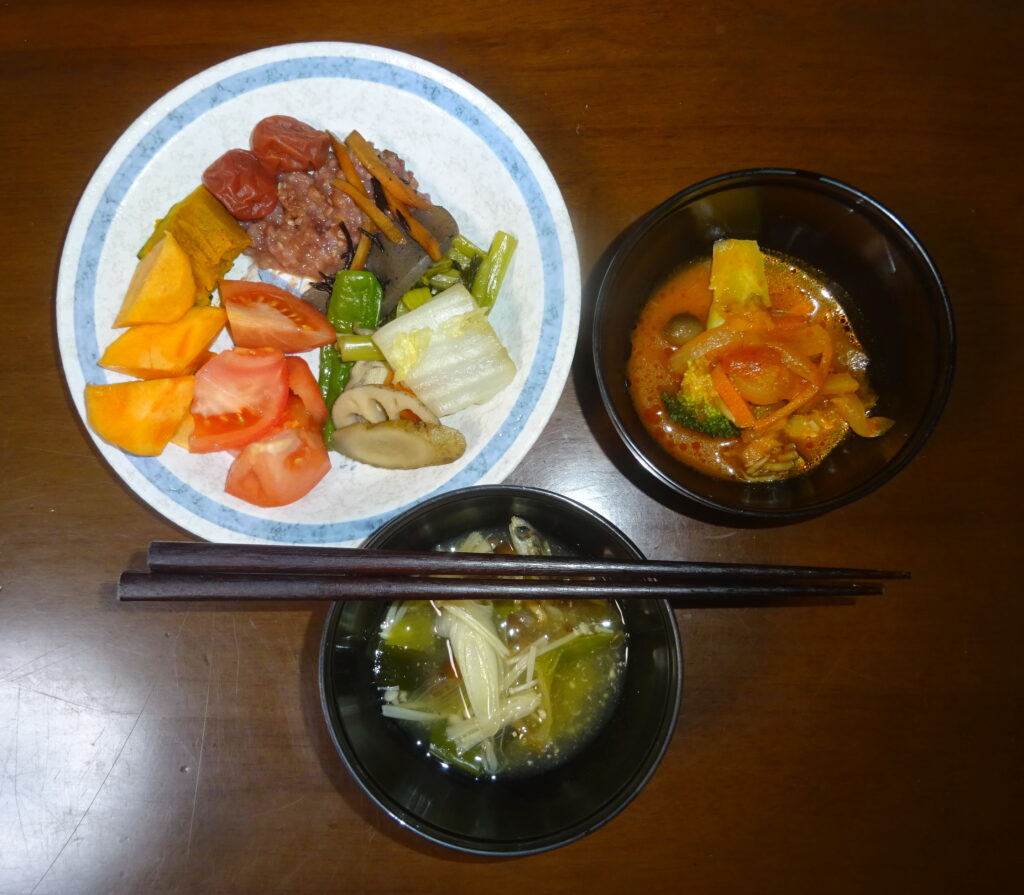 家政婦さんが みずから いいだけ お皿に盛った おかず、味噌汁 と 玄米御飯であります(これに 梅干うめぼし と らっきょうがくわわります)