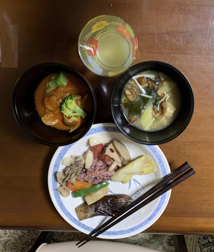 家政婦さんが 自ら いいだけ お皿に盛った おかず、味噌汁 と 玄米御飯であります(これに 梅干 と らっきょうが加わります)