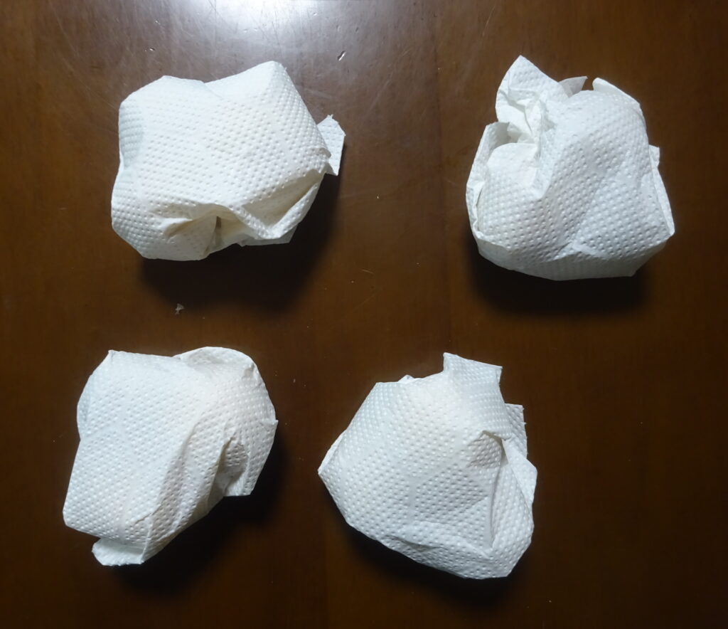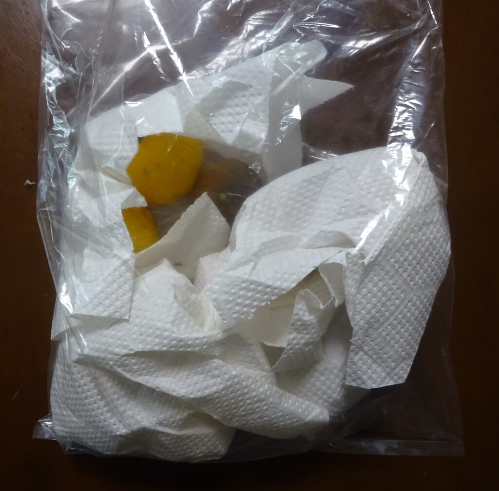 感謝の印として 袋に詰めて あげた、当家の庭で 朝摘あさづみをした 柚子ゆずの実(乾燥しないように、ひとひとつの 柚子ゆずの実を キッチン ペーパーで つつみ 冷蔵庫で保存しました)