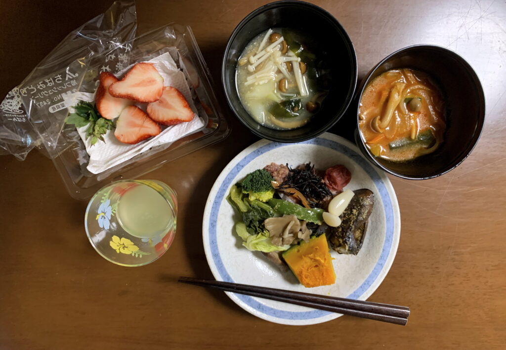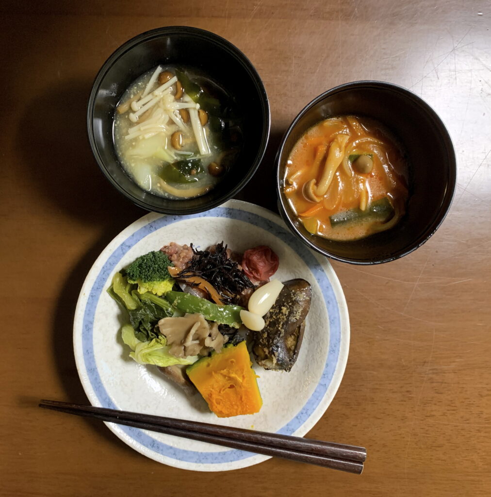 家政婦さんが みずから いいだけ お皿に盛った おかず、味噌汁 と 玄米御飯であります(これに 梅干うめぼし と らっきょうがくわわります)