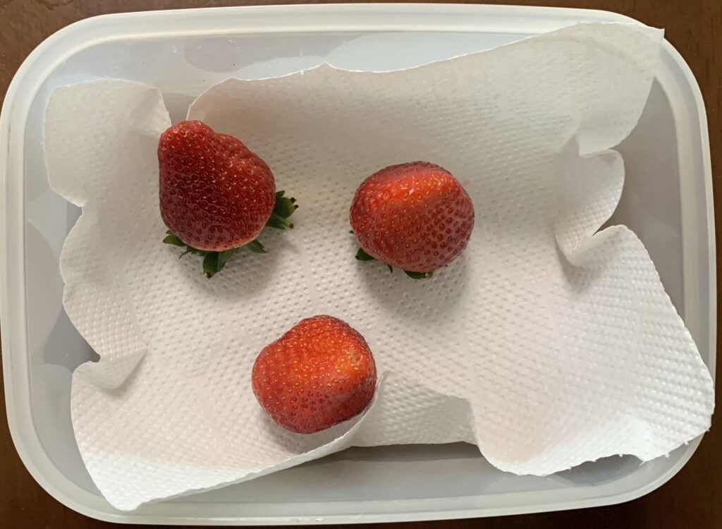 前述いたしましたように、大粒の(いちご)を あげました(水分を切って キッチン ペーパーをいて ひとひとつの(いちご)かさならないように あいだけて へたを下にします。そして、上から ふた もしくは ラップをしました)