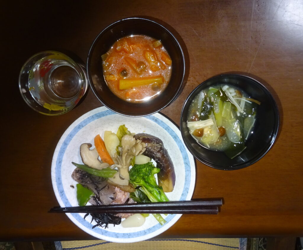 家政婦さんが 自ら いいだけ お皿に盛った おかず、味噌汁 と 玄米御飯であります(これに 梅干 と らっきょうが加わります。