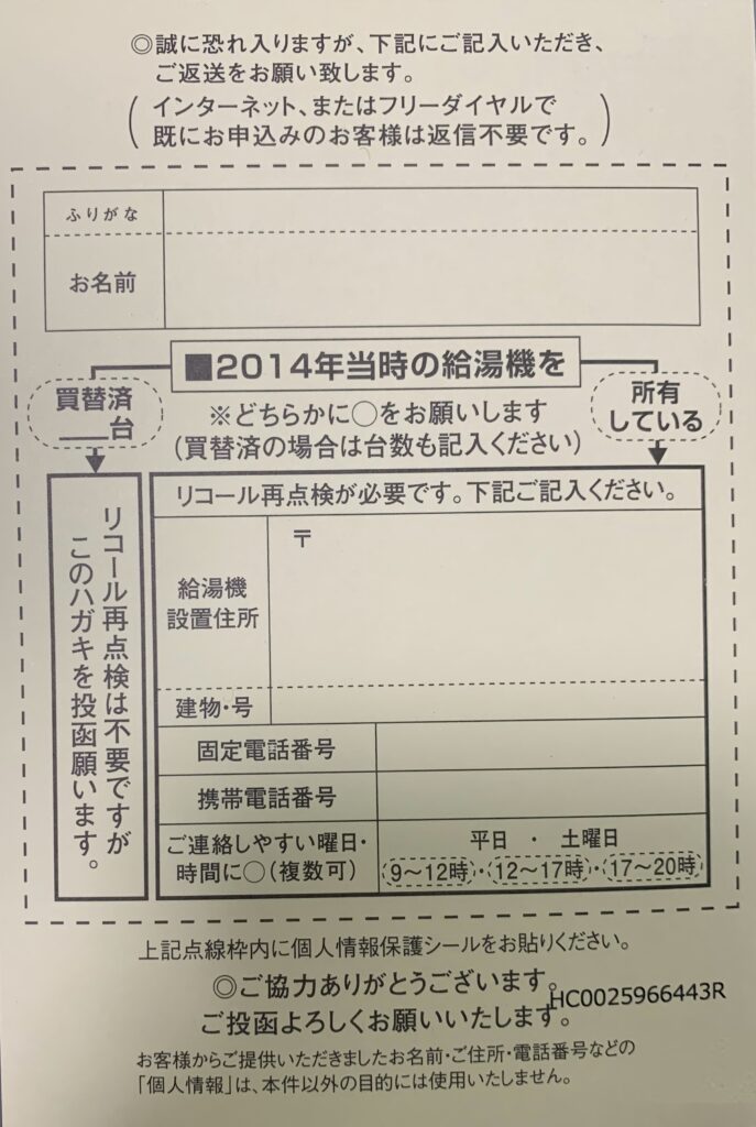 「(前略)しかしながら、その後、2022年8月の弊社リリースにてご案内のとおり、点検・部品交換を行った一部の製品で 適切な部品交換が行われていないことが判明したため、先般、弊社からは、無料での再点検実施のご案内を郵送いたしました。(後略)」とのことでありますが、誠に遺憾なことに、郵送されておりません。