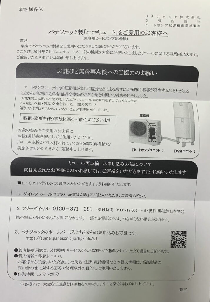 パナソニック製「エコキュート」 リコール点検品の再点検 ご協力のお願い(この内容を 抜萃して 上に記述しました)