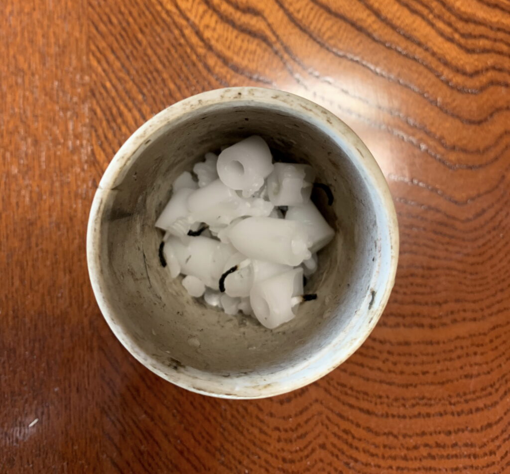 蝋燭の燃え残りが 一杯になった 仏壇の容器(旧家)