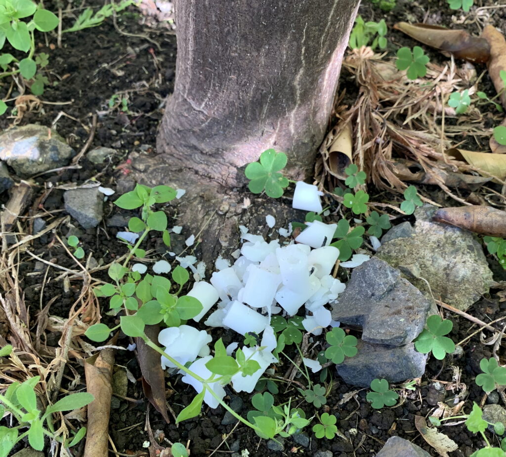 当家の庭の植物(楓の木)の根元に撒いた 蝋燭の燃え残り。そして、水を あげました