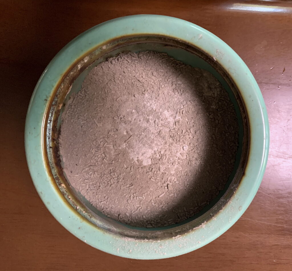 しかして、今回は 仏壇の香炉(新家)の線香の灰も 一杯になりましたので、当家の庭の植物の根元に撒いて 水を あげました。