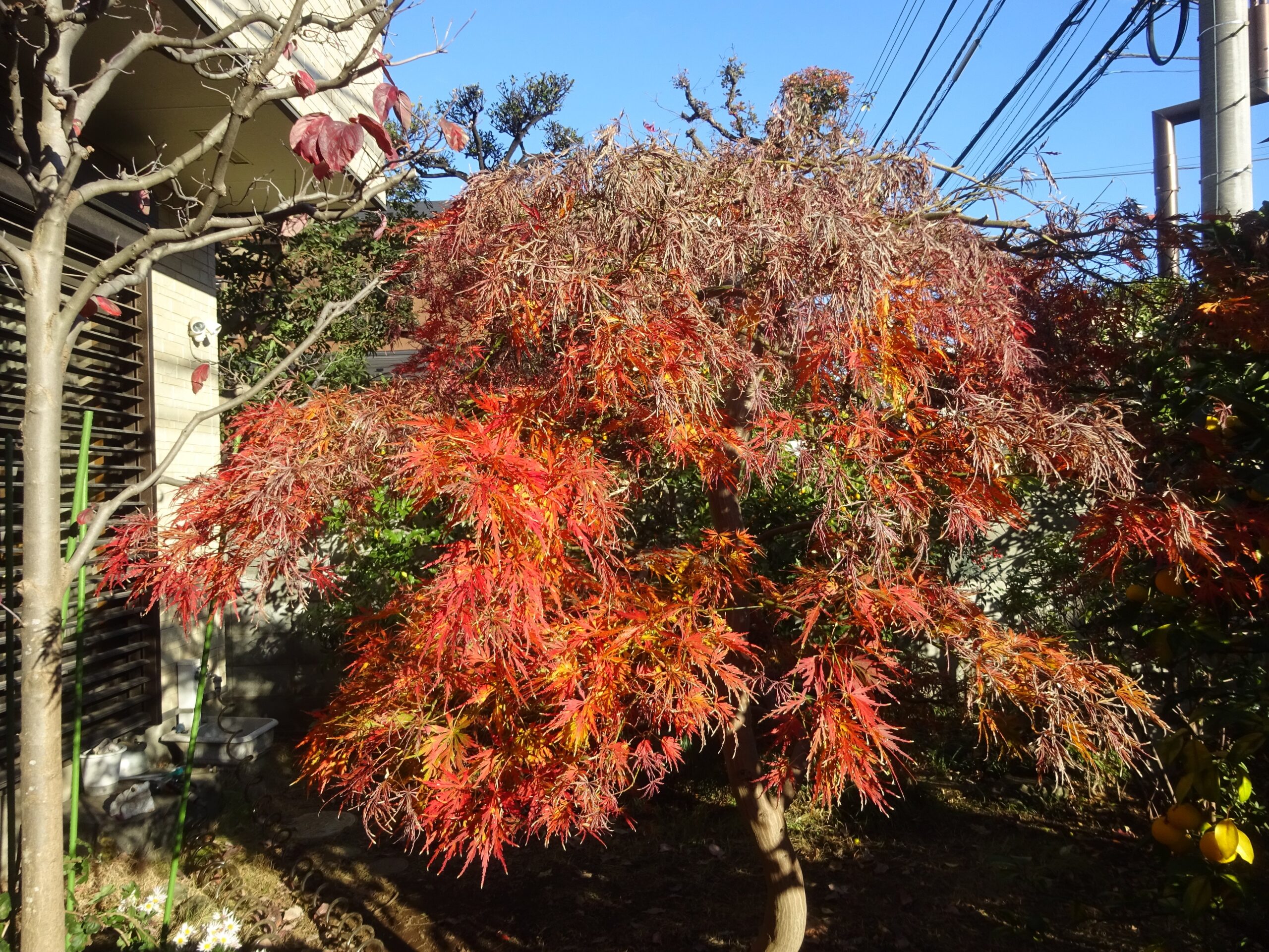 更 に、楓の木が紅葉致しましたので、この写真を 大きい画像で 下に掲載させて頂きます。以前、父親によりますと 紅葉しない方の 安い楓を購入したとのことでありましたが、何故か紅葉しました。楓に因ませて頂きますと、高校生時代の夏、京都の貴船神社に参りましたときに、新緑の楓が綺麗だったことが思い出されます。機会がありまして 宜敷ければ、この旅のことを記させて頂きます。なお、カナダ(英語・仏語: Canada)の国旗には、楓が描かれていますね。また、砂糖楓からは、メープル・シロップ(英語:maple syrup) が取れます。