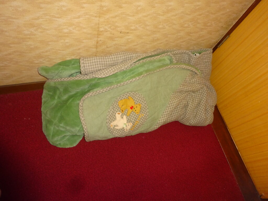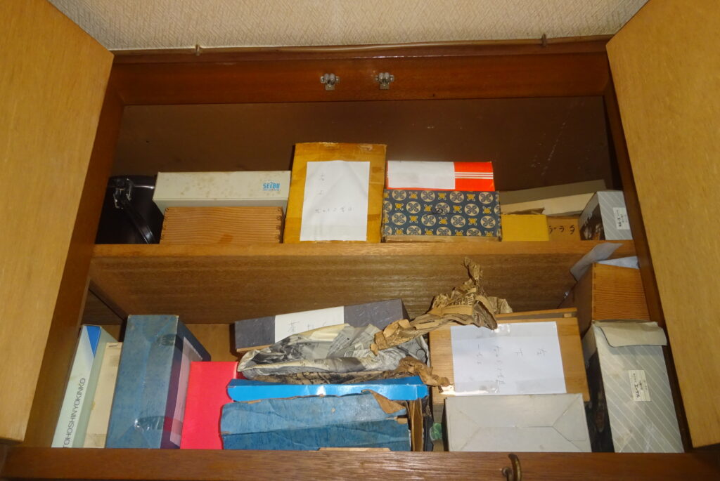 ビニール袋で 覆いをした 毛布 や 衣類など(旧家・2階・元 従業員の部屋)