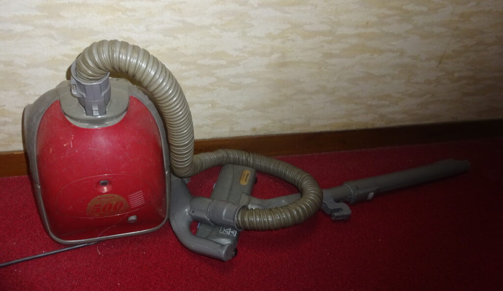 ビニール袋で 覆いをした 電気掃除機(旧家・1階)(この掃除機を出すときに 電灯線を抜いてしまい 冷蔵庫と電話機に電源が行かなくなりました。それで、その電話機は 時間設定をしなければなりませんでした)