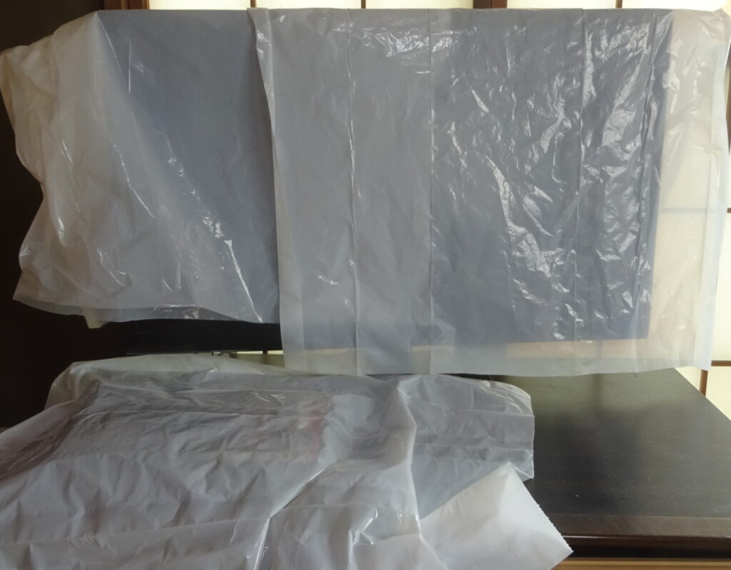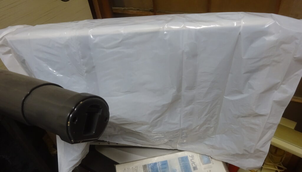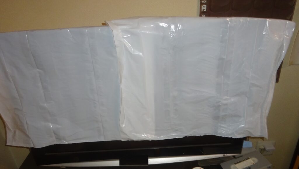 更に、パソコン や テレビなどの精密機器 そして 植物などには、下の画像のように ビニール袋で 覆いをしました。因 みに、パソコンのハード ディスクの中 や ディスク ドライブ内迄 薬剤が行き届く可能性が考えられるとのことであります。