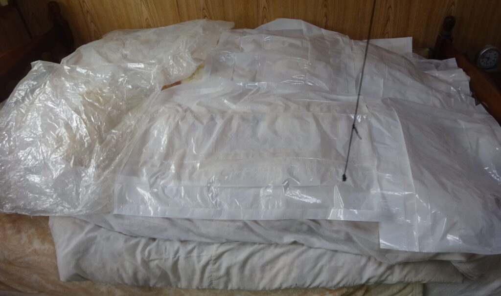 ビニール袋で 覆いをした ベッド(旧家・2階)