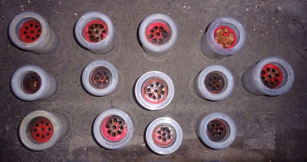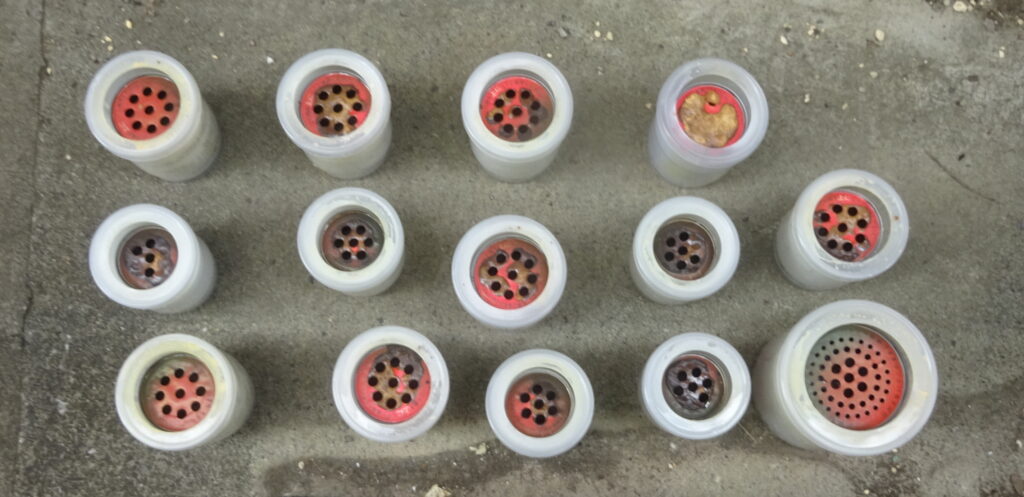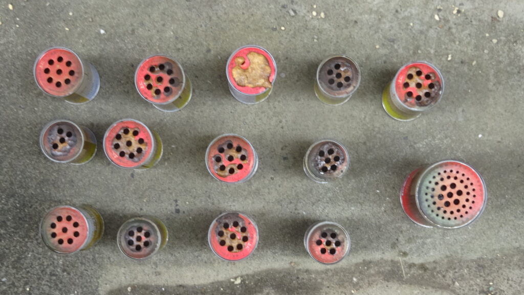 使用後の 燻蒸式の医薬品(各部屋に 一個 配置して、全部屋 同時 使用が効果的とされております。因みに、水を入れた プラスチック容器を まず 先に 各部屋に セットして、その後 奥の部屋から 順に 薬剤缶を 水に 浸けていきます)