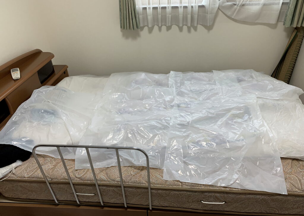 ビニール袋で 覆いをした 亡き 母親の ベッド(新家・2階)
