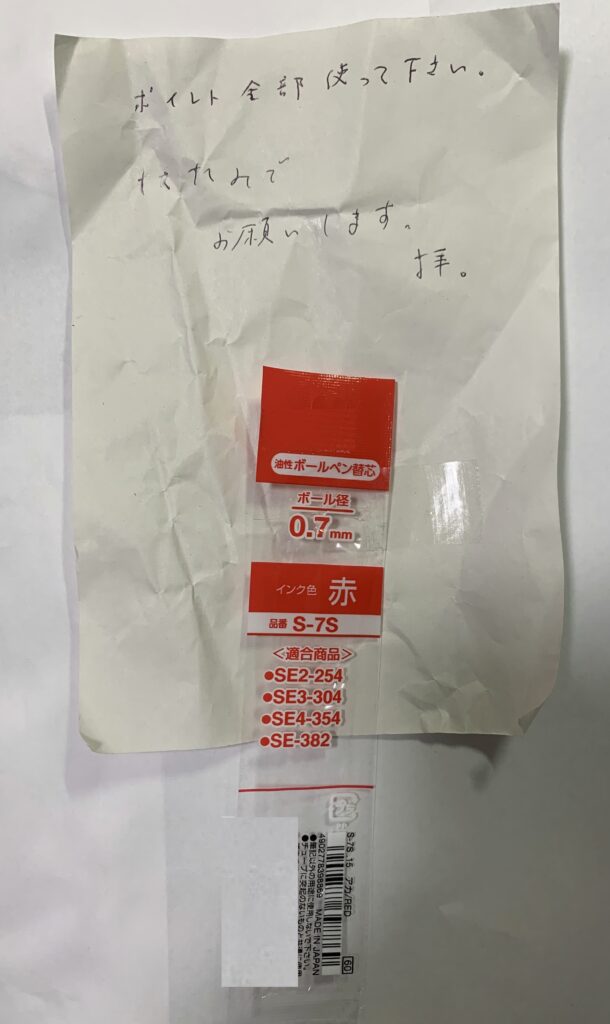 および、本日の午後3時過ぎに 夏物のクリーニングを持って行きました。因みに、誠に有り難いことに、担当は、前述致しました 以前 名刺を手渡した「高萩」という 高齢女性でありました。但し、奥の方に 引っ込んでいますので、入店する迄は 誰か 分かりませんでした。なお、「高萩さんが 担当で よかったです。」と伝えました。そして、続けて 「今朝 店に行くことを思い立ったのでありますが、高萩さんが担当であるような 予感がしました。」と話しました。誠に有り難いことであります。序で乍ら、平日 このクリーニング店は 昼休憩 PM14:00~15:00なのであります。因みに、本日は 土曜日なのでありますが、この時間 すなわち 午後3時過ぎに来たと話しました。なお、その担当者によりますと、引取ですか とのことでありました。それで、その逆の預けですと 答えました。しかも、環境の為に ハンガー仕上げではなくて、以前から「たたみ」にしています。すなわち、ハンガーは不要にしています。序で乍ら、赤の油性ボールペンの染み抜きをしてもらいました。因みに、水性ですかと尋ねられたので、上記のように 油性ボールペンであると答えました。なお、前回 その同じ 担当者から 汗抜きウエットクリーニング すなわち ドライクリーニング と 水洗いの2度洗いをしてみて 染み抜きができるかどうかを 見てみましょう と言われて、2倍 以上の料金を支払って その汗抜きウエットクリーニングを行ないました。ところが、誠に遺憾なことに、染み抜きが出来ていませんでした。序で乍ら、その担当者は 上記のように 水性ボールペンによる 染みと勘違いしていたのかもしれませんね。そうして、今回 染み抜きを委託することになりました。因みに、参考に 下の画像の ボールペンの替え芯 赤を持って行き 下のメモを 手渡しました。ところが、折角 用意したにもかかわらず、持ち帰ってもらいたい とのことでありました。それで、口頭では 伝えましたが、上記のように しっかり 「たたみ」になっているかどうか 不確かでありました。それで、その担当者によりますと、電話番号の 下4桁を教えて下さい とのでありました。そこで、そのクリーニング店の アプリをインストールしていることを伝えました。それで、会計で ¥2,385円を支払いました。なお、いつものように 領収書を くれませんでしたので、受け取りのときに もらえば いいですかと話しましたら、領収書を くれました。序で乍ら、仕上がりは 半月以上 先の 3月1日でありました。但し、その担当者によりますと、それよりも 早くなるだろうとのことでありました。しかし乍ら、誠に遺憾なことに、アプリでは 反映されないとのことでありました。因みに、これでは やはり 確実な 3月1日にくるしか ないと思われましたので、3月1日に来ますと伝えました。